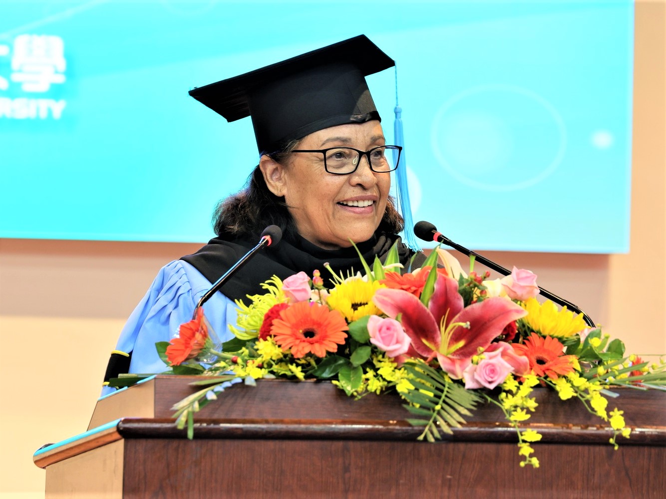 外交部主任秘書唐殿文致詞指出,很榮幸出席嘉義大學為海妮總統閣下頒授名譽博士學位的儀式,海妮總統在教育及國家發展方面的卓越成就,使她當之無愧獲得這一殊榮。嘉大授予海妮總統教育學名譽博士學位,不僅彰顯她在太平洋地區的領導能力,也肯定她對性別平等的貢獻。海妮總統於2016年成為馬紹爾群島共和國首位女性總統,她深信教育是國家的基石,並高度重視人權保障。在她的任內,致力於提升人民福祉,為國民提供獎學金以促進教育機會。此外,海妮總統也積極推動與臺灣的教育合作,以提升馬紹爾群島共和國人民的教育水準。