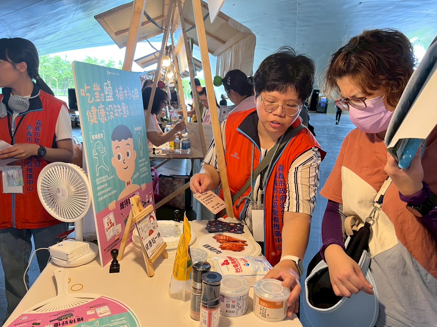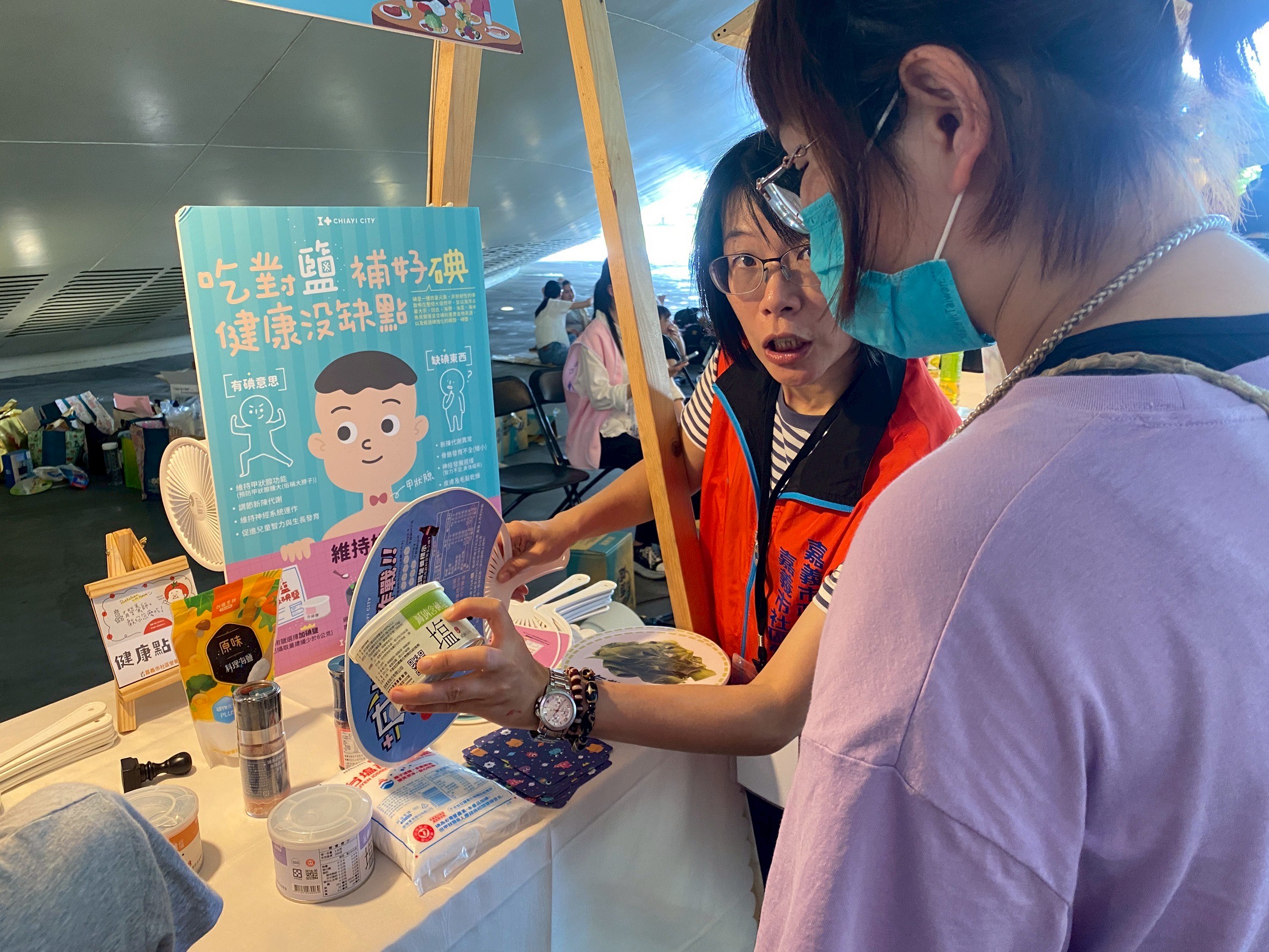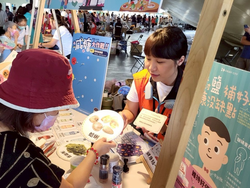 嘉義市社區營養師為讓營養教育更貼近生活6/7日於國民健康署「113年度全國社區營養推廣中心成果展」活動,設計「吃對鹽、補好碘,健康沒缺點」碘鹽卡牌,讓參與民眾玩牌學營養,並以問答互動及視覺辨識,帶領民眾認識碘的營養價值、缺碘對健康的影響,學習認識富含碘的天然食物(如海帶、紫菜等)及市售含碘食鹽產品,吸引許多民眾駐足參與。
