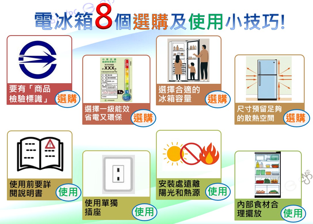 消費者在選購電冰箱時除了品牌、容量及價格考量外,應更加注意使用安全,經濟部標準檢驗局臺南分局提供8個選購及使用小技巧,讓您安心選購放心使用: