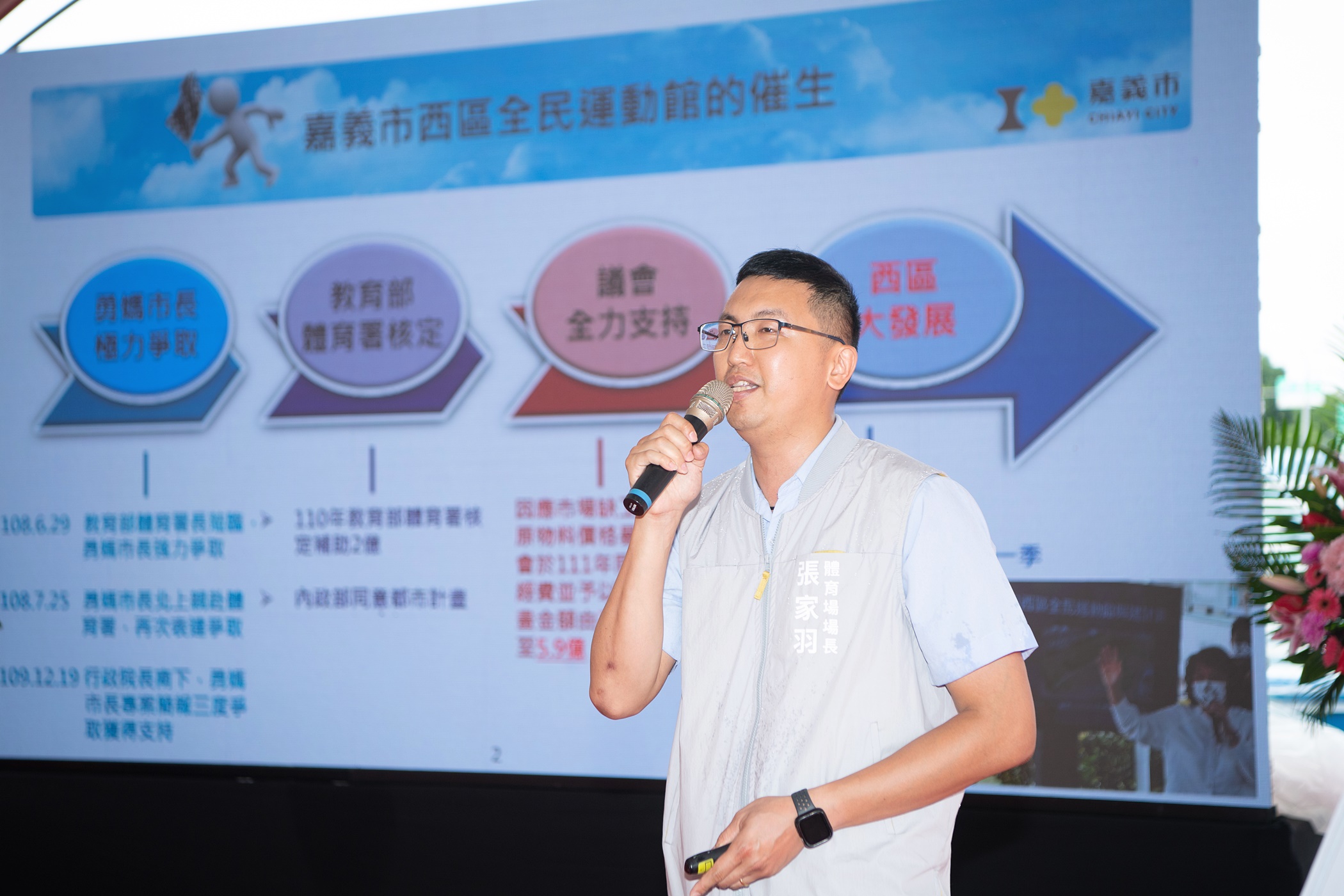 市府教育處郭添財處長補充說明指出,在市民引頸期盼之下,黃敏惠市長自108年上任起,不斷積極爭取及展開實質規劃,西區全民運動館方能應運而生,在全民運動風氣日漸蓬勃之下,嘉義市西區全民運動館不僅能帶動規律運動人口,更能促進運動消費、提升市民健康水平,以降低社會健保成本支出、並提升運動產業的經濟產值。