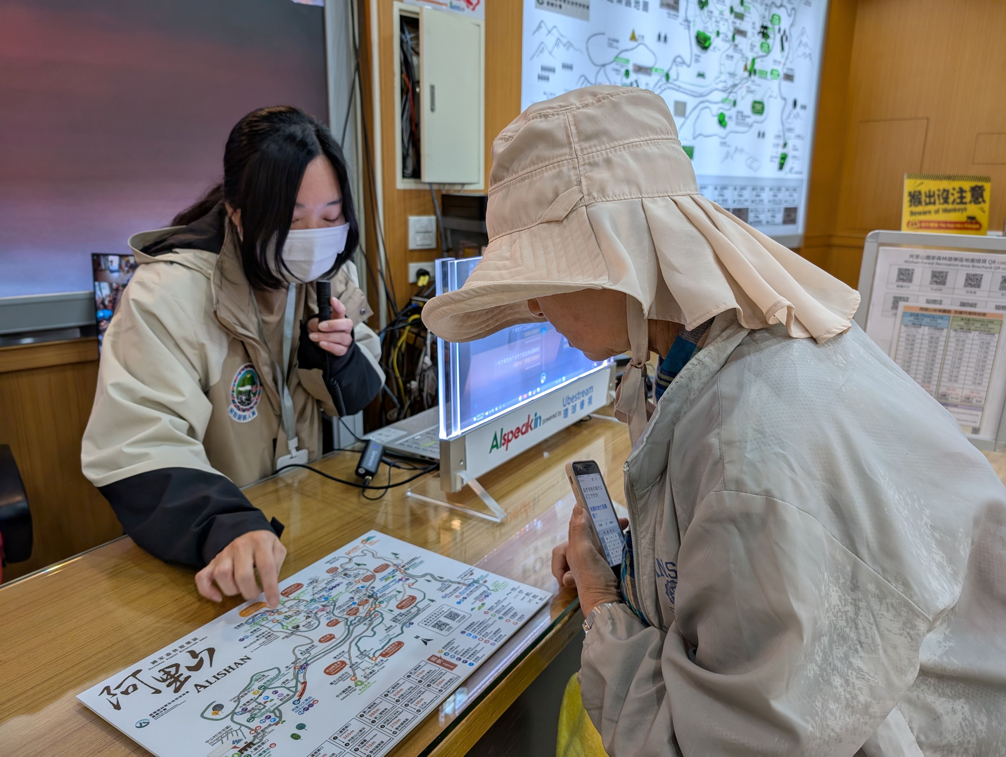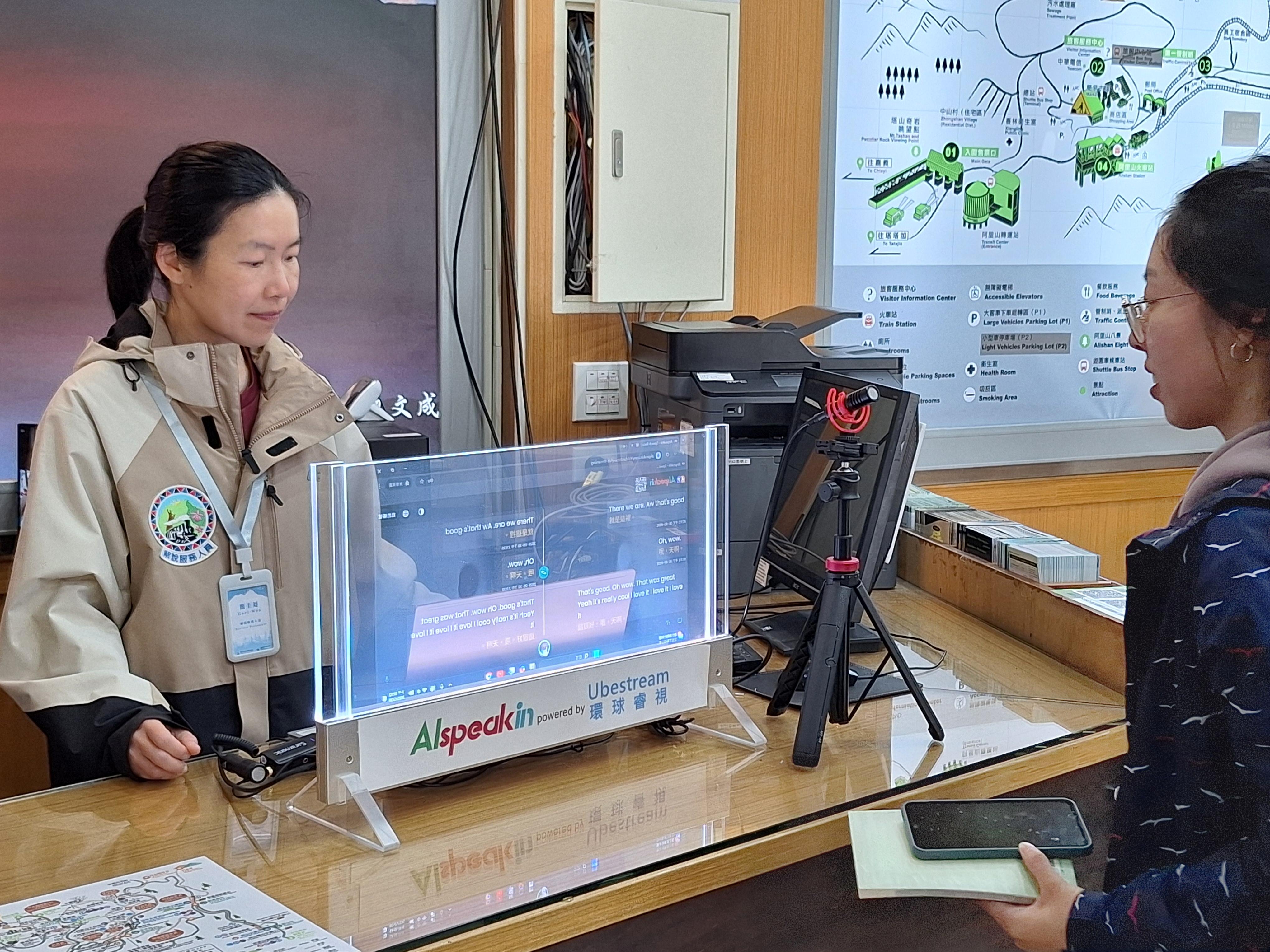 為提升服務品質,嘉義分署率先於阿里山國家森林遊樂區引進AI智慧櫃台,藉由搭載30多種語系AI資料庫運算能力,可達專業口譯人員水準,並透過雙向透明螢幕,提供與遊客面對面翻譯服務,當外語服務人力不足時,所有服務人員皆可透過AI智慧櫃台填補服務需求。