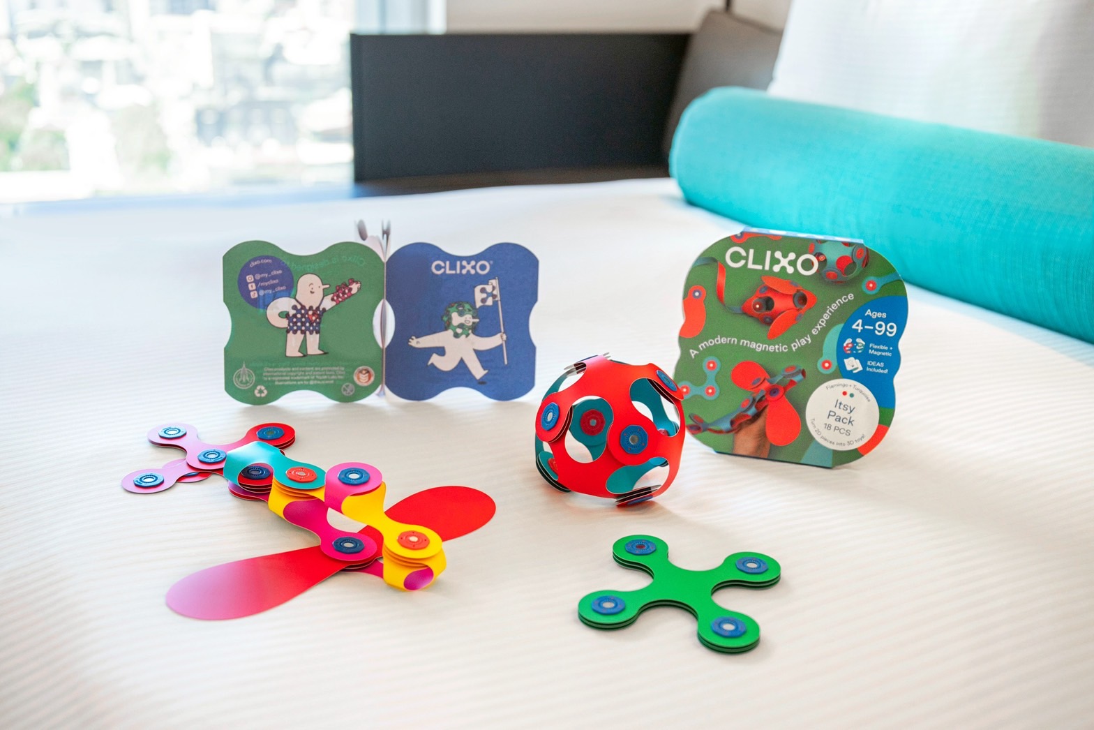 圖說:台北凱達大飯店攜手美國創意玩具品牌CLIXO創樂多推出「手牽手.玩創意」住房專案,家庭三人房每晚3,888元起,入住即贈價值千元的「CLIXO創樂多磁力片基本款」乙組。(台北凱達大飯店提供)