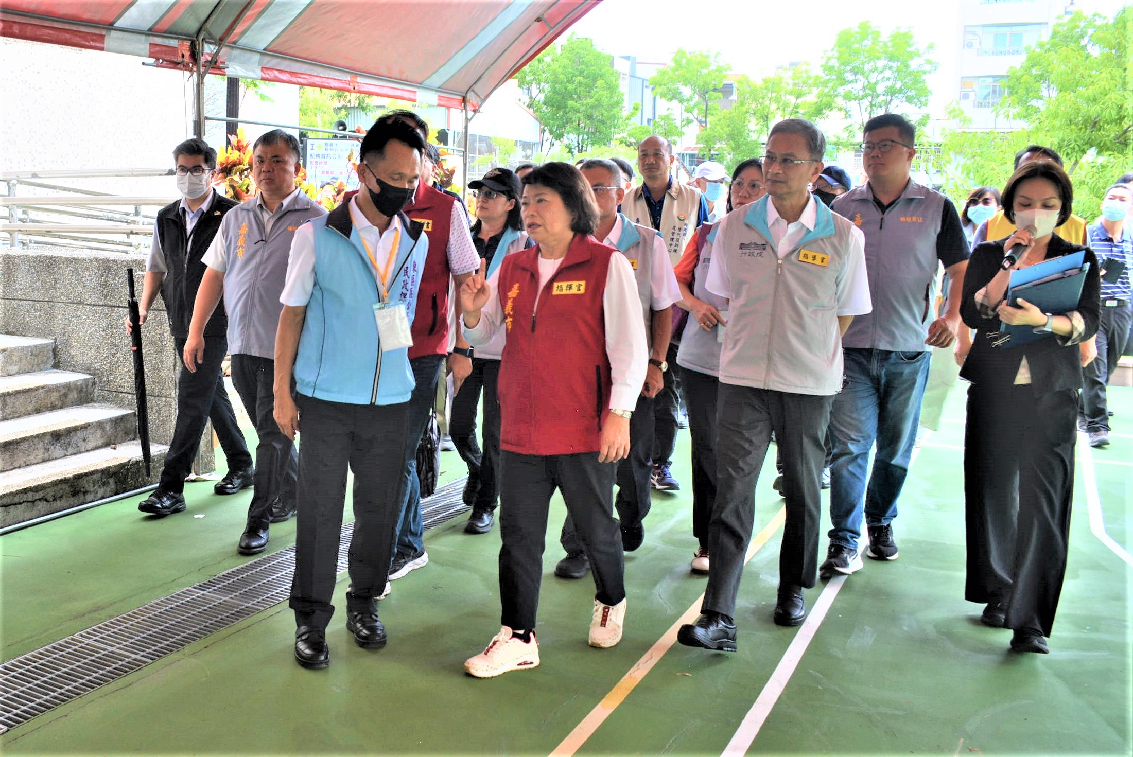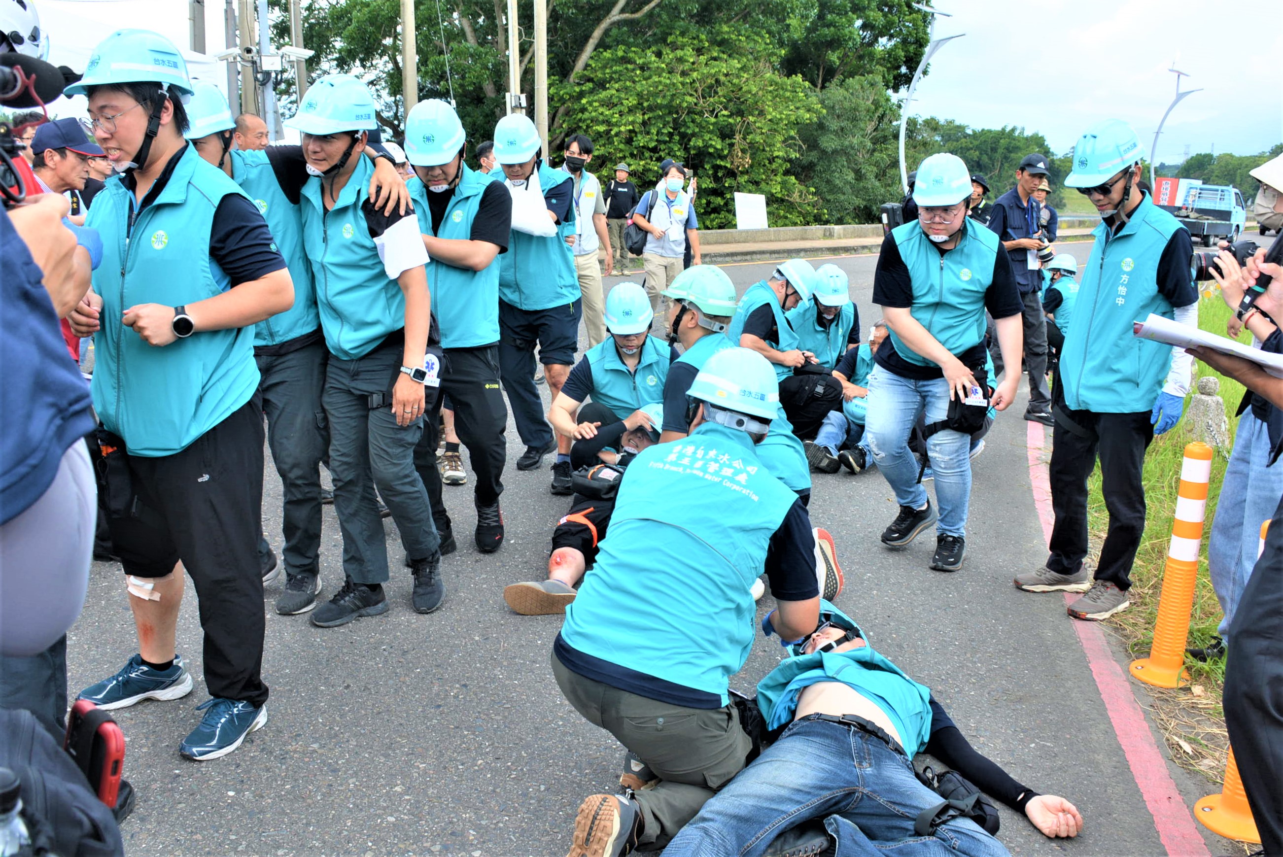 下午的實作演練則分別於四個場地實施,首先來到崇文國小:模擬民生物資短缺,開設配售站調度糧油奶粉等,並處理現場混亂與秩序維護,之後前往蘭潭水庫,演練水庫受損後的緊急搶修與人員傷亡救援;另為演練傷患救護,第三站至西區衛生所,模擬設立急救站應對大量傷患分流與後送作業,最後則在民族國小,設立收容救濟站,實施災民安置、物資供應、心理輔導與傳染病防控;針對假訊息傳播、心理作戰進行應變教育與輿情穩定措施。
