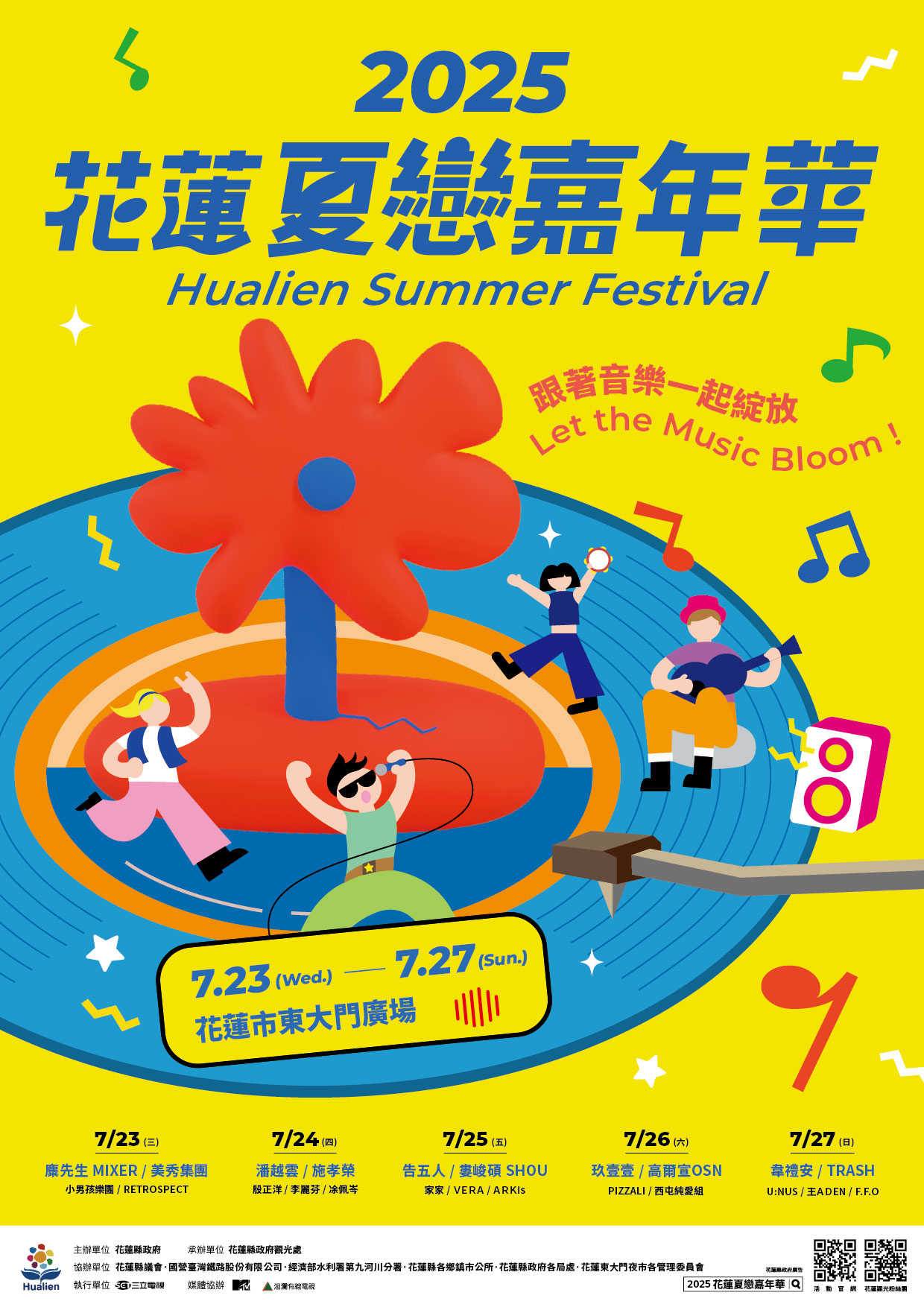 花蓮夏戀嘉年華今年同樣集結全臺 25 組 超強人氣卡司輪番上陣,目前公布的演出陣容包括:麋先生、美秀集團、潘越雲、 施孝榮、告五人、婁峻碩、玖壹壹、高爾宣、韋禮安、TRASH、PIZZALI 等知名 藝人與外籍樂團 RETROSPECT。「只要一張火車票」,就能享受高規格演唱會級的精彩演出,場場免費入場。主辦單位提醒樂迷把握機會,盡早安排住宿與交通行程,一起來花蓮度過最熱血的仲夏夜!