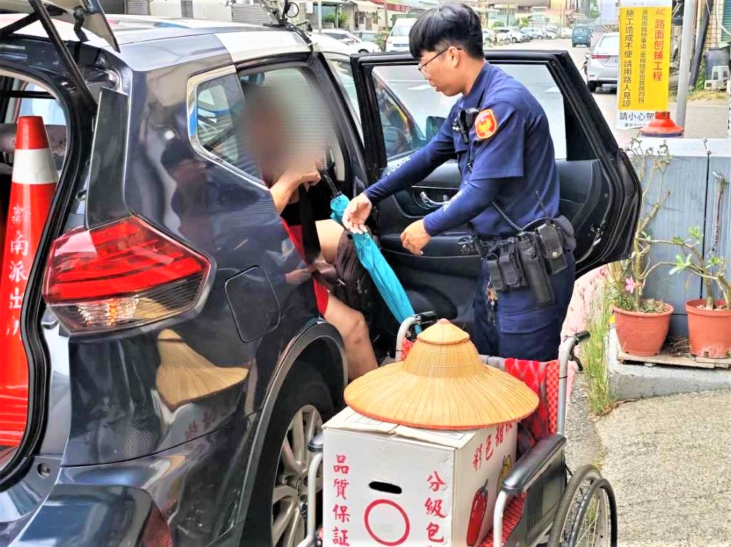 〔記者林健昌/嘉義市報導〕嘉義市政府警察局第二分局新南派出所警員張丞富及楊明勳日前擔服巡邏勤務,接獲勤務指揮中心通報,指稱在體育路段,有1名老婦人疑似迷途,需要警方到場協助,警方到達現場關心,並詢問該老婦人,老婦人向警方表示,她是居住在芳安路一帶的居民,因要去施打疫苗便獨自1人推著輪椅出門,但年邁身體機能退化,當打完疫苗後體力不支,才會先行坐在路旁休息。