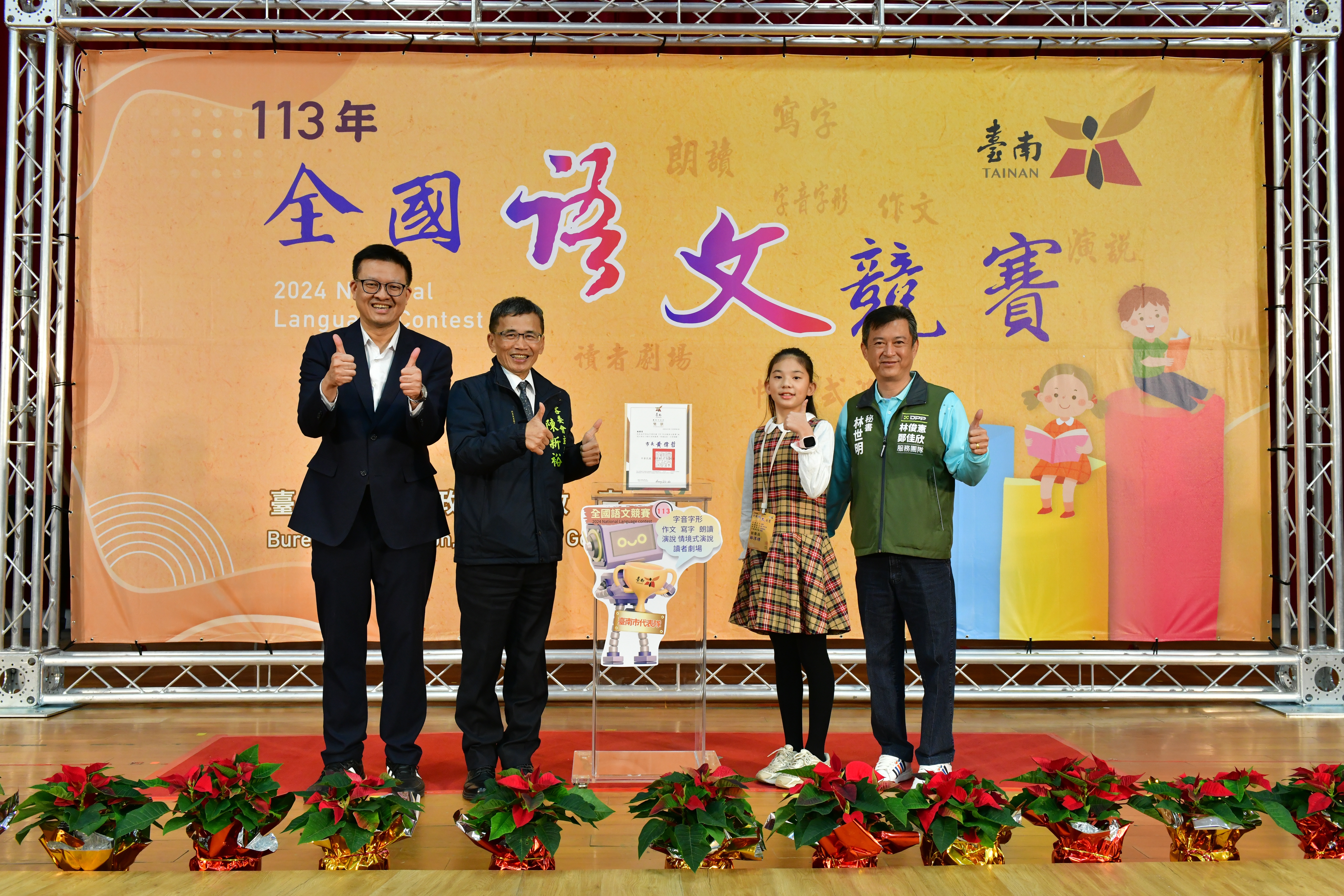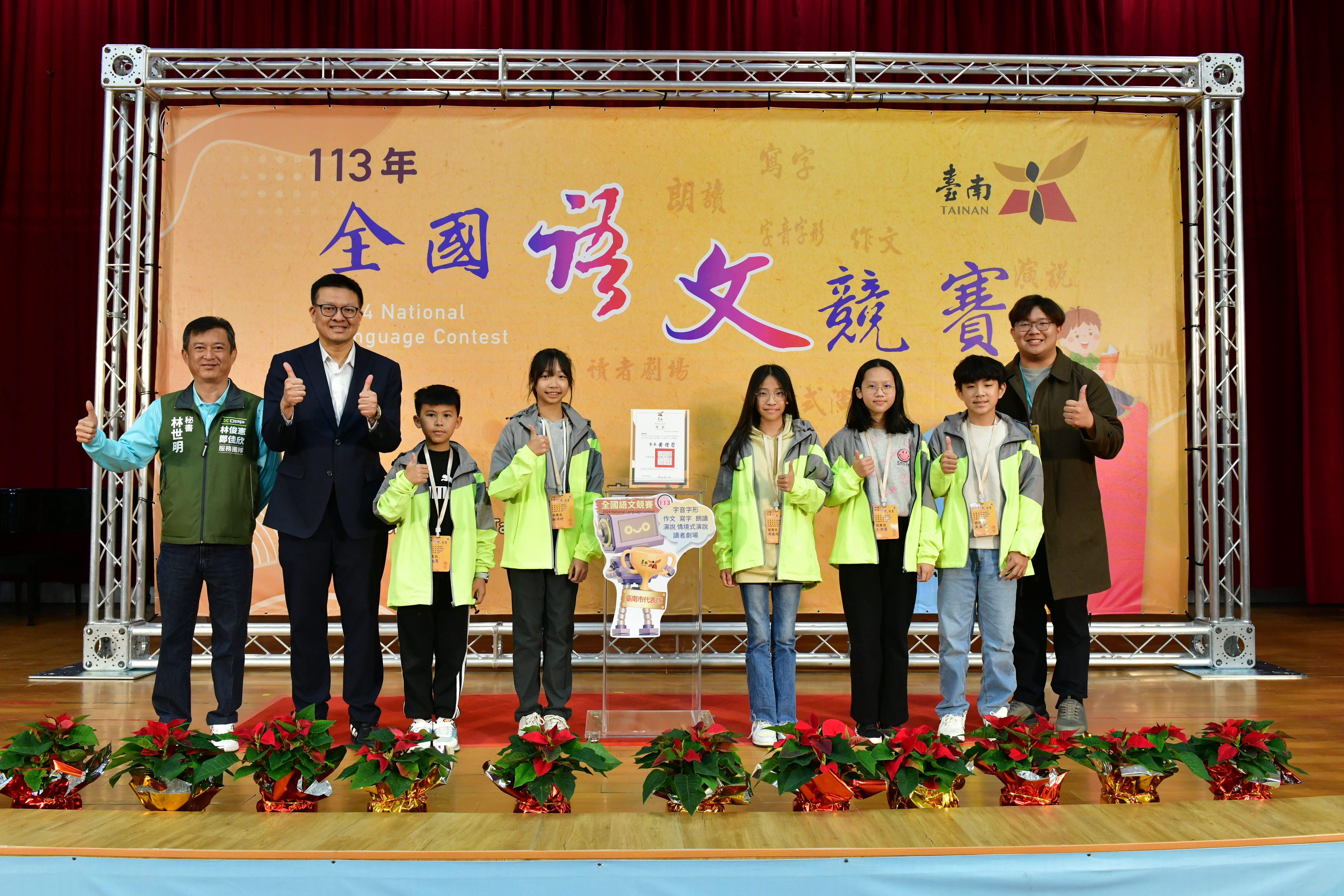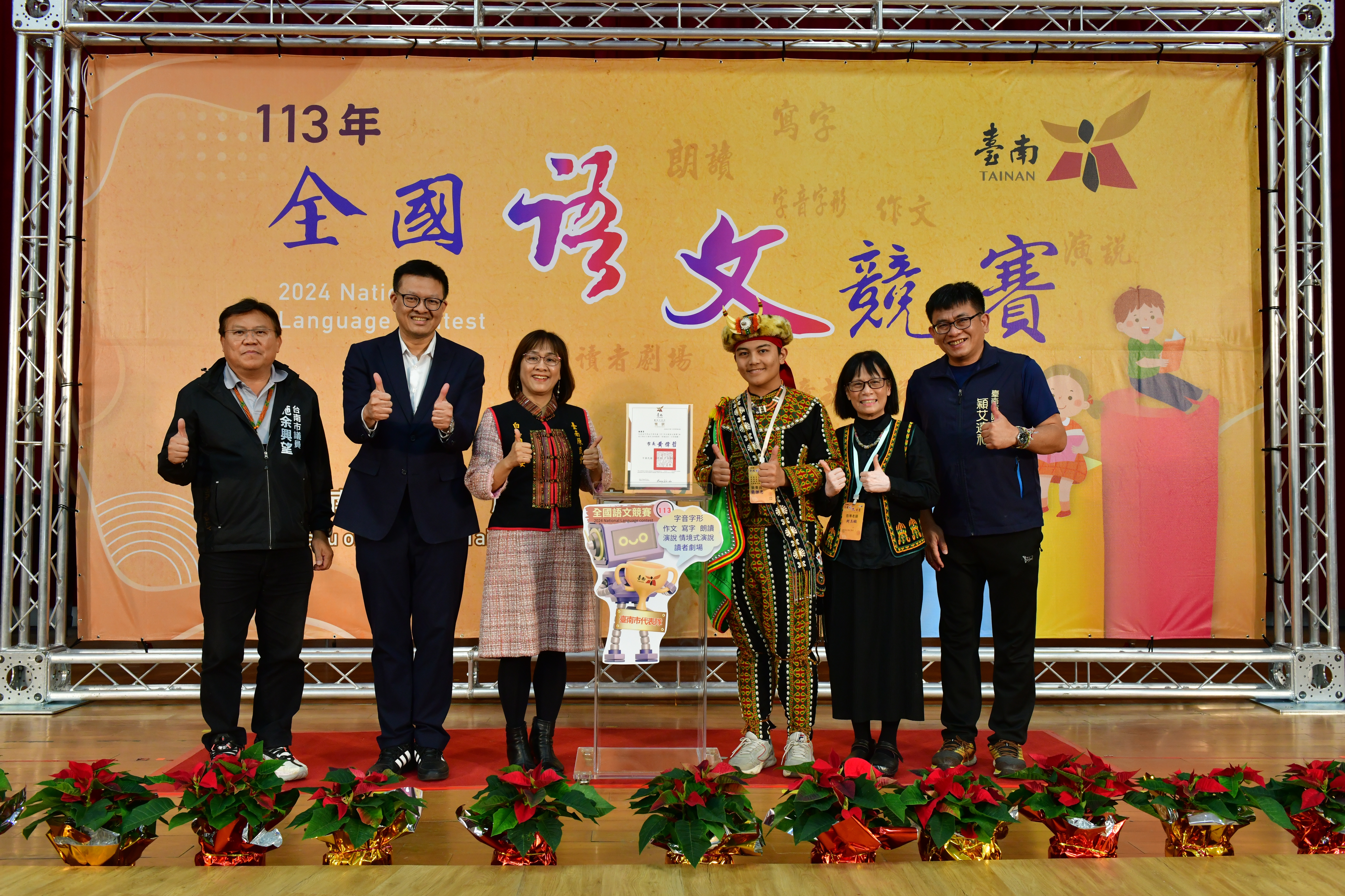 黃偉哲市長表示,臺南市重視孩子們的語文表達能力,長期挹注資源涵養學生語文核心素養,並將善用語文表達,奠基全球溝通力,列為臺南五大教育願景之一,恭喜得獎師生,也感謝集訓講師及指導老師持續耕耘培育基層選手,齊心為語文教育努力,傳承語言文化與演繹之美。其中臺南高商的簡傑恩同學在族語老師柯玉緞教導下,從小練習扎根魯凱族語,獲得108年國小組朗讀特優、109年國中組朗讀特優及113年高中組情境式演說特優,情境式演說包含看圖說故事及現場問答,考驗學生的臨場發揮及對母語的熟稔度,在非原鄉的臺南,獲獎實是難能可貴。