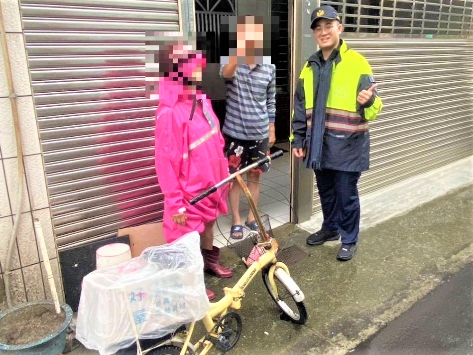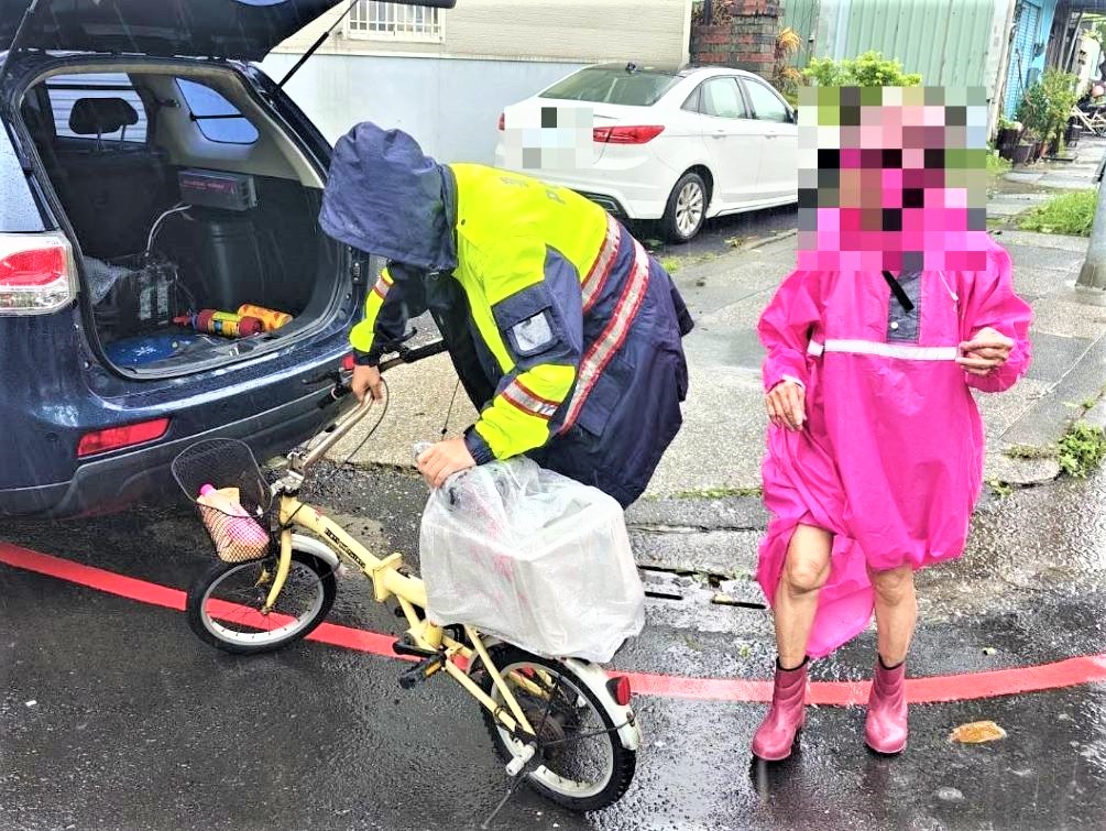 〔記者李寧/嘉義市報導〕嘉義市政府警察局第二分局南門派出所警員楊智鴻、林義倫及實習生吳翊銨於日前擔服巡邏勤務時,當時外頭正下著傾盆大雨,卻見1名身穿雨衣的老婦人牽著腳踏車至派出所報案,焦急稱說自己忘記回家的路怎麼走了,請求警方協助,警方了解狀況後,便駕駛巡邏車將老婦人平安送返家。