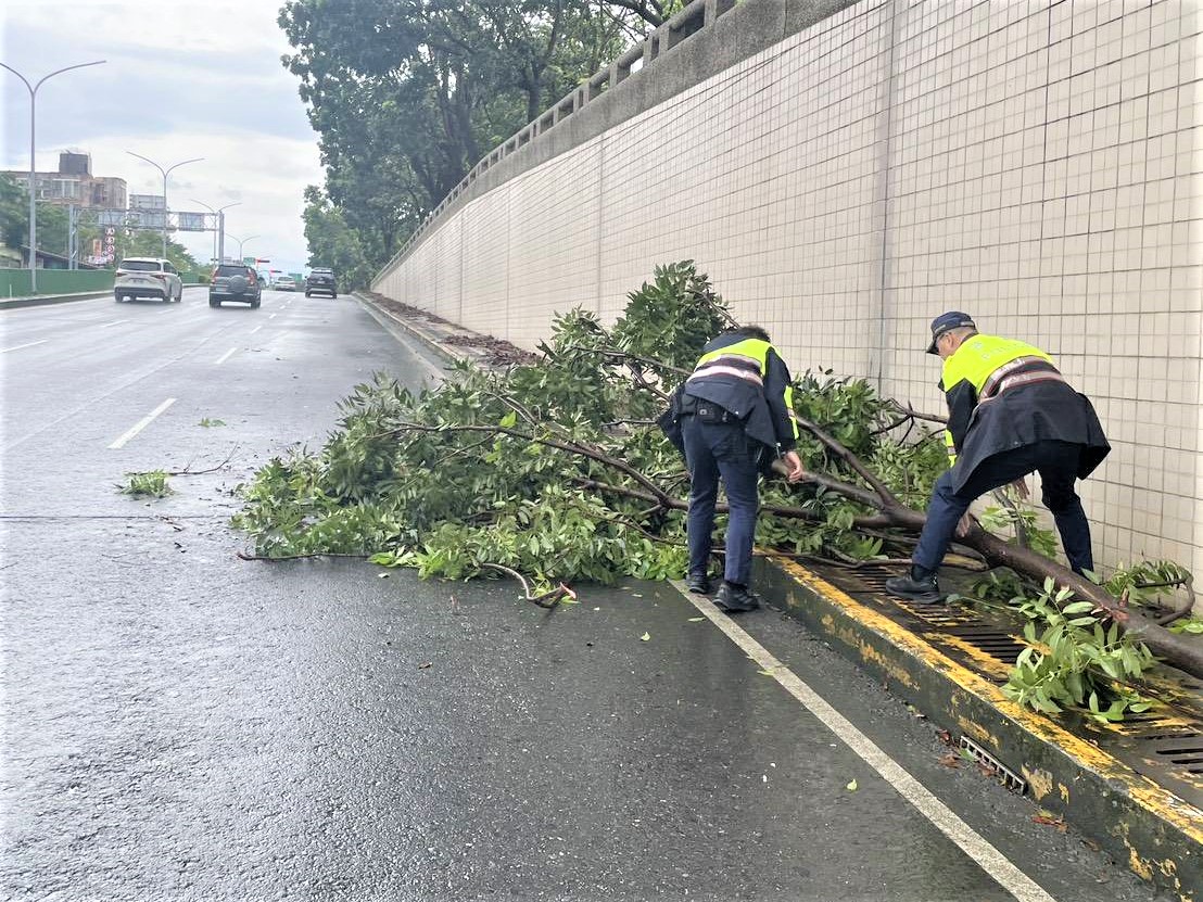 世賢路地下道是聯外交通重要道路,當時雖非尖峰時段,但現場仍是車流通行頻繁,員警見狀毫不猶豫立即下車查看狀況,展現出高度警覺與迅速應變能力,為避免後方車輛因視線不清或閃避不及而引發交通事故,員警迅速在現場周邊擺放三角錐設置警示標誌,以提醒用路人注意確保來往人車通行安全,合力將倒塌枝幹搬離主要車道,並確認無人員傷亡及其他車損情形,由於倒塌樹枝範圍廣泛,合力清除障礙物,直至初步排除交通危害,後續亦同步聯繫市府相關單位派員前來清理餘枝及後續處理。