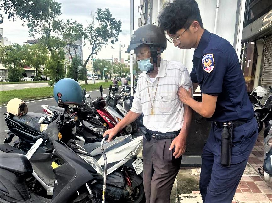 〔記者李芸蓁/嘉義市報導〕嘉義市政府警察局第一分局北鎮派出所警員許宸皓與實習生張唐墉日前擔服勤區查察勤務時,在自由路與友愛路口處眼尖發現一名年邁老翁神情疲累手持助行器坐在路邊無法行走,經員警主動上前關心了解得知36年次黃姓老翁患有輕微失智現象,當天上午獨自外出要到自由路附近路段散步,不料越走越遠身體突然感覺不適,且忘記如何回家的路而坐在路旁邊休息。
