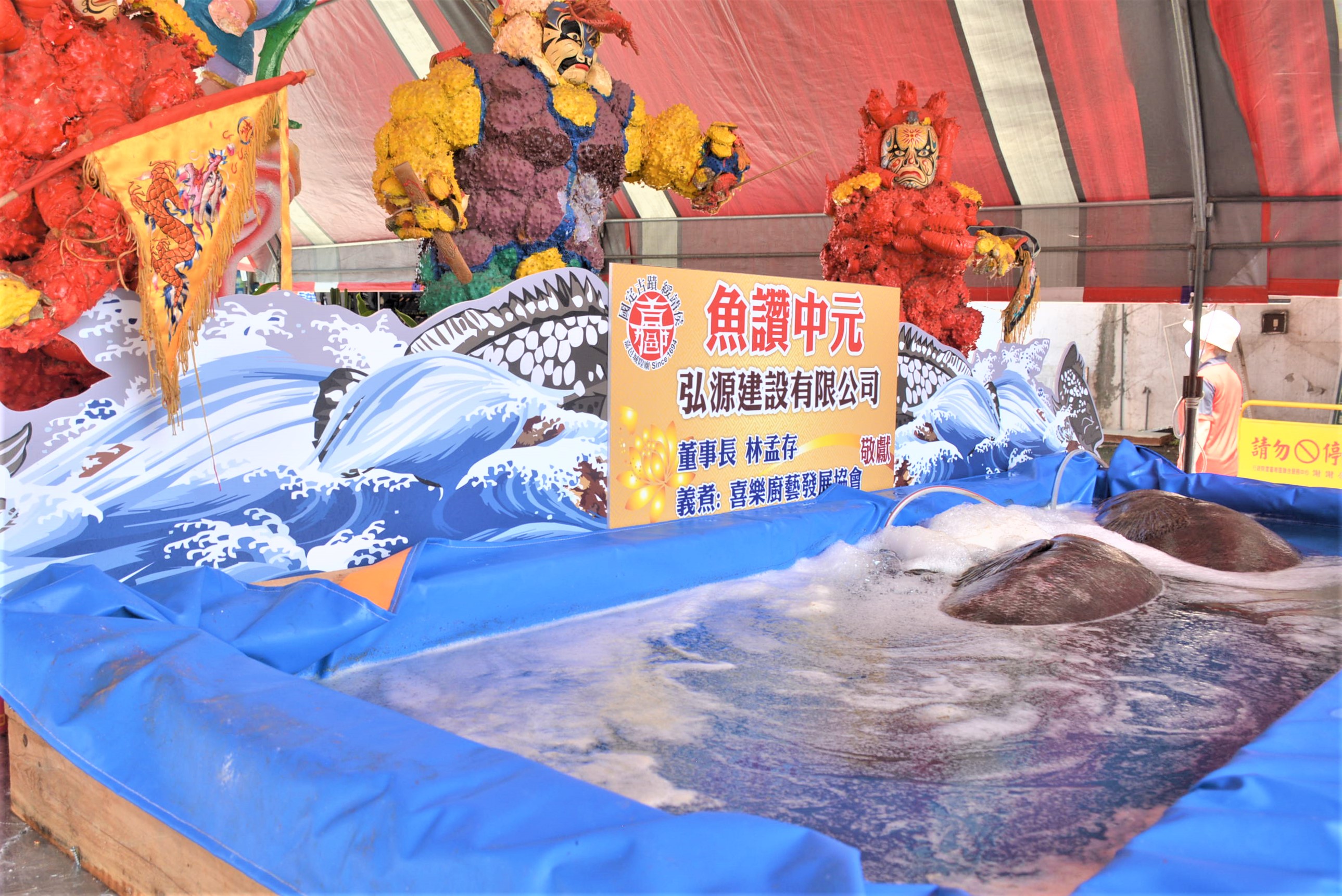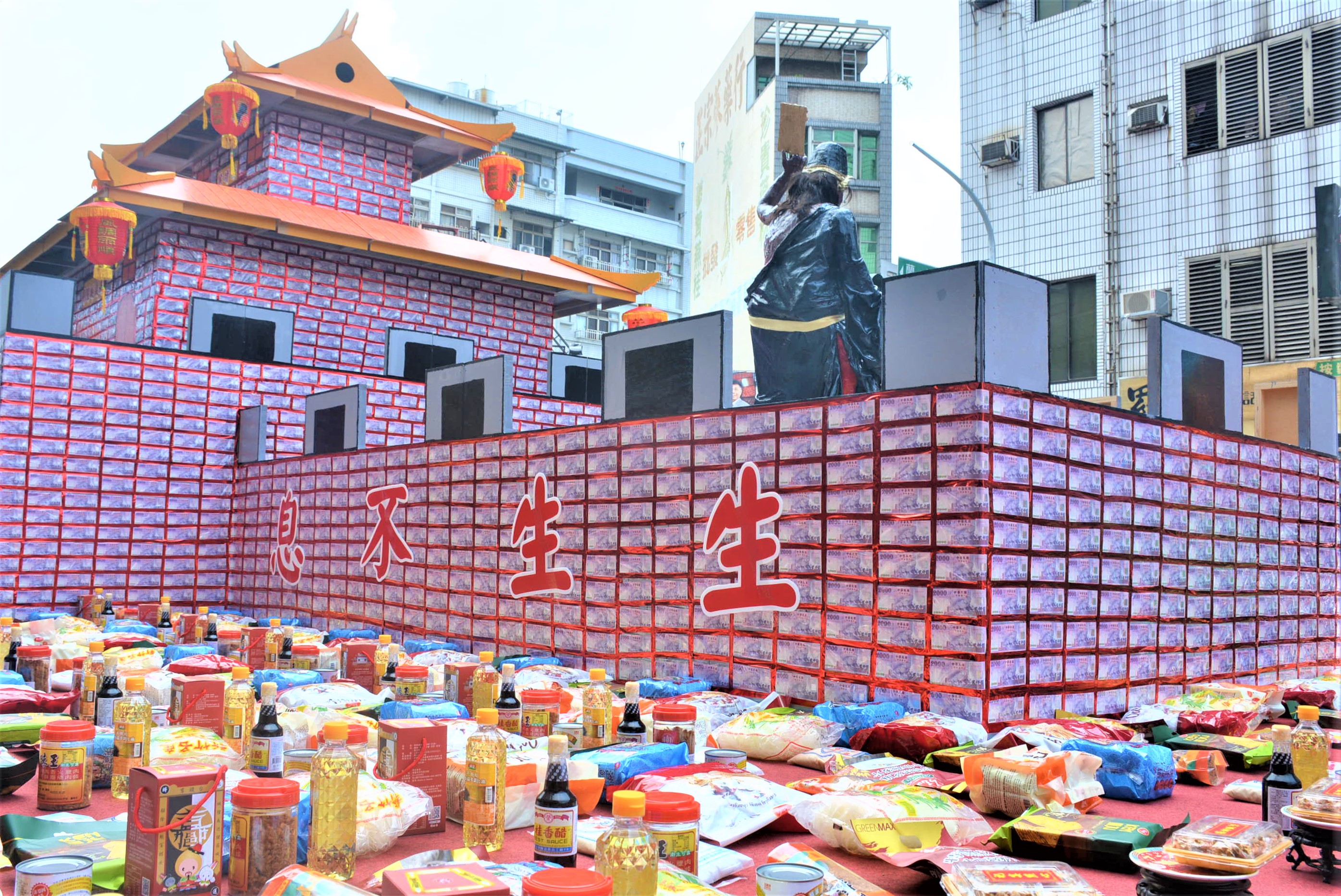 嘉義市是全台少數仍保存「分區輪流普度」習俗的城市,每年農曆六月廿七日起,嘉義城隍廟透過起鼓、豎燈篙、放水燈、淨爐除穢、門鬼開及開普大典等儀典,完整再現莊嚴的「中元普度」古禮;今年於城隍廟的祭典,除傳統供品外,更融入嘉義特色產品,規劃七大主題景觀,其中最吸睛的莫過於以7,500張兩千元紙鈔堆砌、總值1,500萬元的「錢進諸羅 千萬城門」,吸引民眾駐足拍照討論;還有結合水果、豬肉、烤雞的「水果肉山」,象徵城隍庇佑百姓;另外,也有以嘉義噴水池、大火雞與香腸豬打造的「生生不息 時來運轉」、耆老展現捏麵工藝的「佛國樂嘻」、嘉義魚市場獻上的兩尾180公斤龍膽石斑「魚讚中元」等,展現出傳統與創新的結合,現場氣勢宏偉,吸引各界矚目。