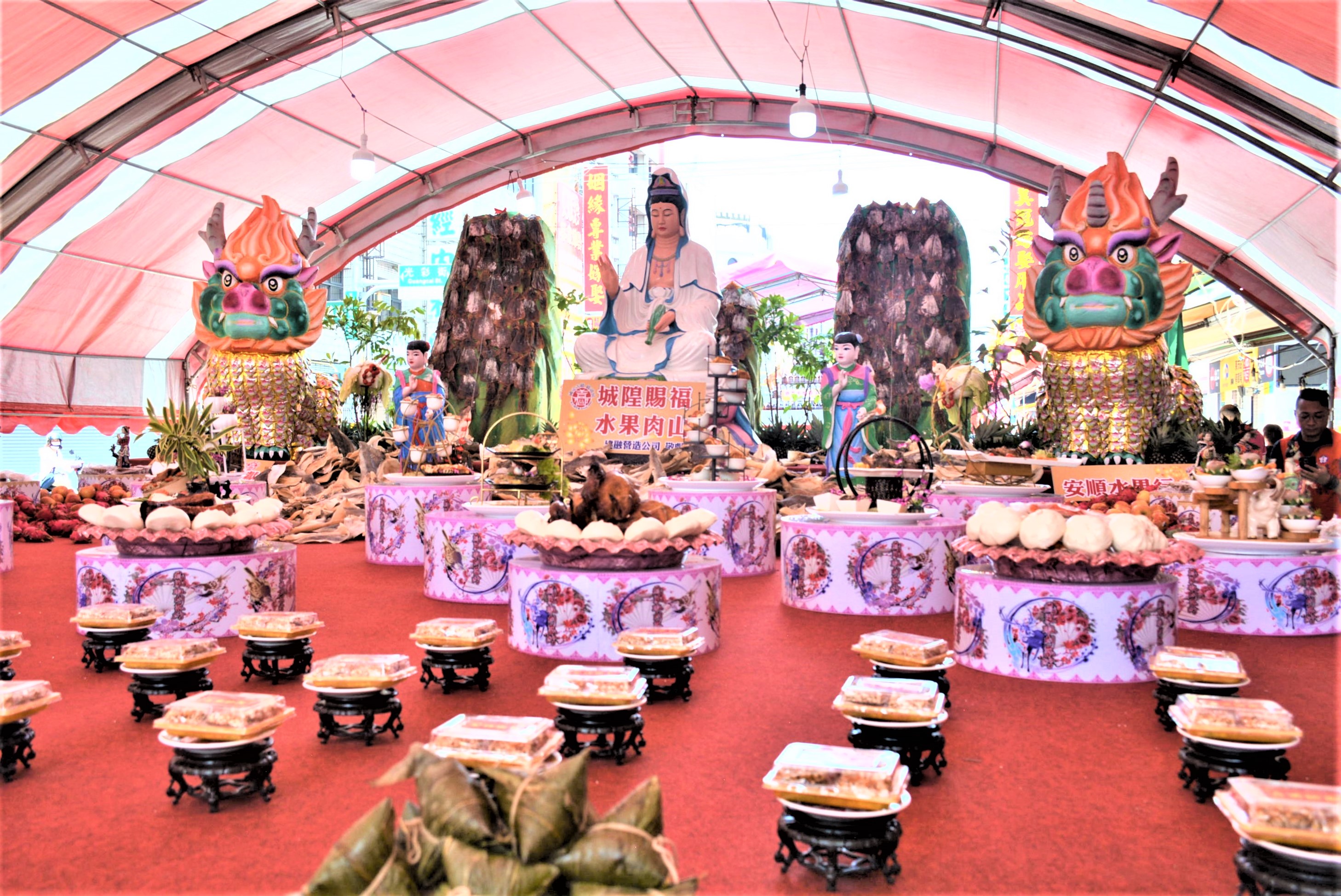 嘉義城隍廟董事長賴永川表示,今年農曆7月1日全嘉開普除了準備傳統祭祀供品外特別結合在地特色產品,祭祀擺設規模比去年更為甚大,共有七大主題:錢進諸羅-千萬城門、城隍賜福-水果肉山、生生不息-時來運轉、酒香不怕巷子深、捏麵人-佛國樂嘻、香雞飄十里、魚讚中元精心規劃豐盛創意供品,吸睛亮眼的精彩饗宴,歡迎民眾來嘉看熱鬧。