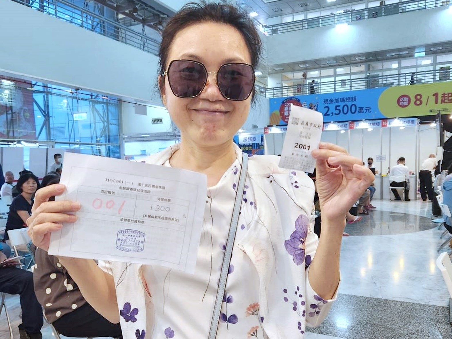 滿千送百9月1日第一位成功換到補助金的蘇小姐分享,凌晨3點半就來排隊。她去年知道活動時已經錯過,因此今年特別積極關注,活動期間總共在嘉義市消費30多萬元,滿千送百沒換完的發票會繼續消費參加購物節抽獎。蘇小姐也特別讚許市府服務好,會事先協助民眾確認發票非常貼心;最後一位兌領民眾林小姐則分享,她已經連續三年參加滿千送百活動,今年原本是候補第27位希望渺茫,沒想到最後竟然能成功兌換,感到非常驚喜與開心,接下來她也會繼續參加購物節發票登錄活動,希望靠著這股氣把百萬汽車抽回家。