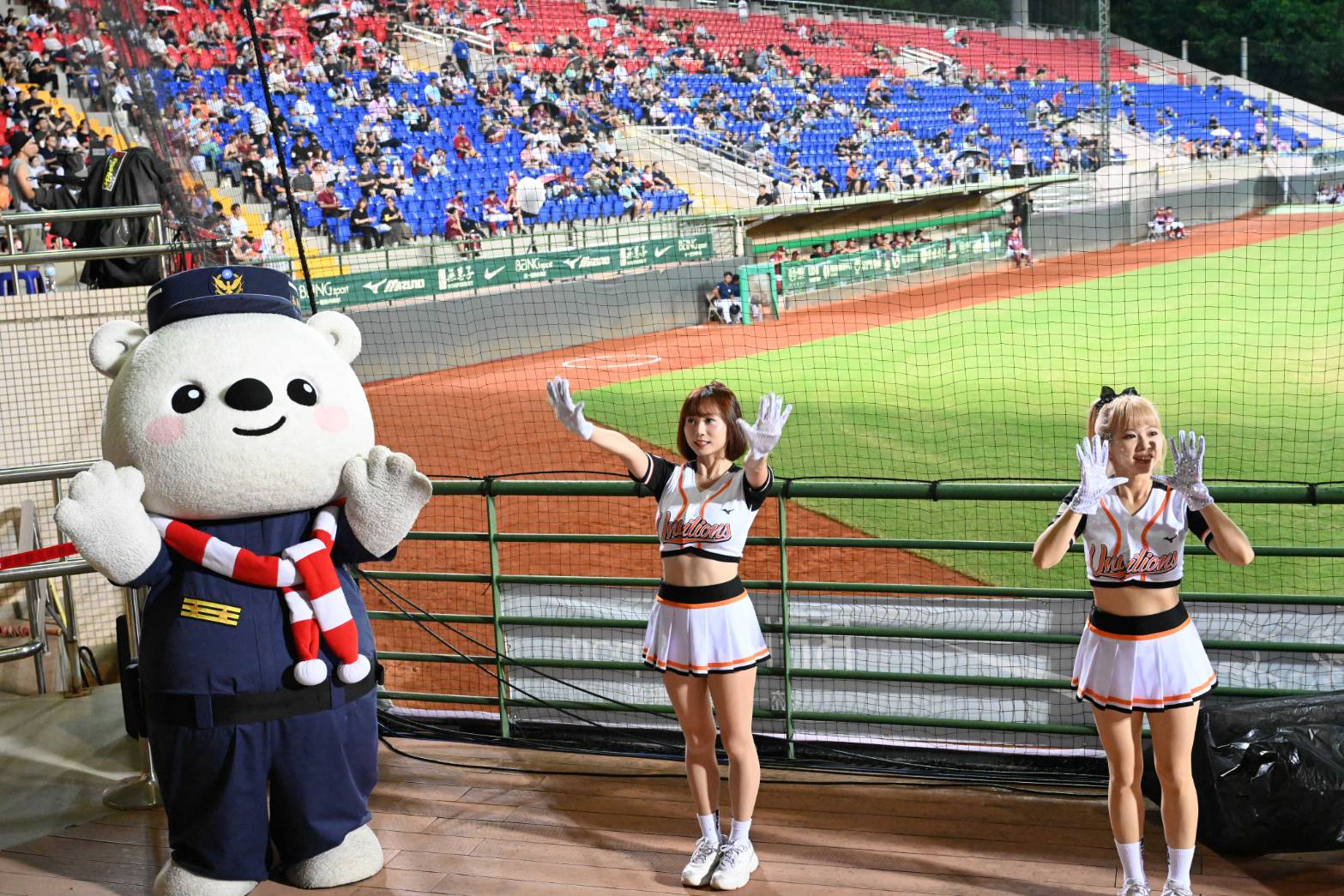 警察局吉祥物「警察大白熊」與統一獅吉祥物「萊恩、盈盈」及啦啦隊Uni Girls一起登場跳舞,為球賽增添亮點、更HIGH翻全場,此外,場內也設置犯罪預防宣導攤位,提供識詐、反毒等多元宣導資料,並舉辦有獎徵答,讓大小朋友都能從互動中認識防詐知識。