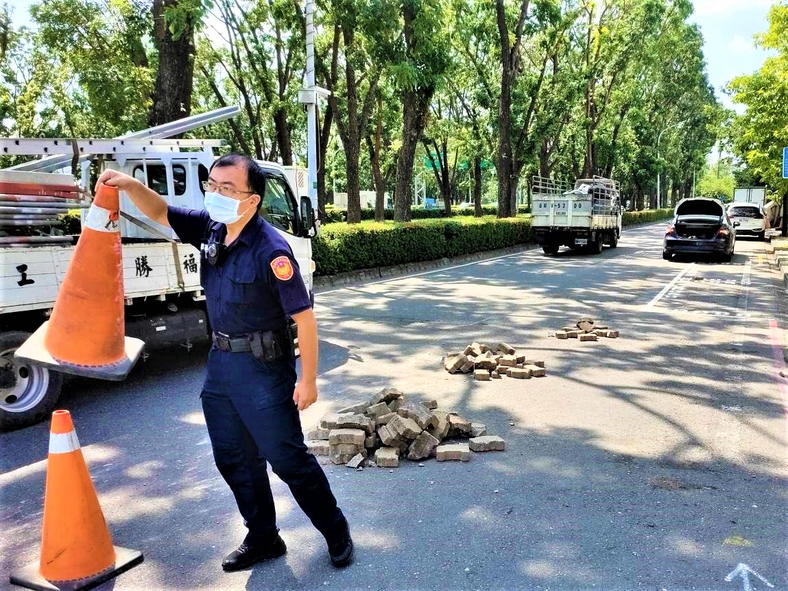 張、蔡2員不敢大意,立即展開交通安全措施,先在障礙物周邊擺放交通錐,提醒後方來車減速慢行,並在安全無虞情況下徒手搬移散落地磚;儘管天候炎熱且車道狹窄,員警仍不辭辛勞,逐塊清除地面障礙,確保用路人安全通行。經初步清理完成後,主動通報聯繫清潔隊到場協助,進一步掃除遺留砂石及碎屑,最終順利恢復道路通行順暢,員警現場協助清理超過多時,有附近居民熱心參與幫忙,時值天氣高溫炎熱全程雖滿身汗水,為維護民眾的安全用路權,積極效率的精神備受當地居民及路過民眾讚賞及肯定。