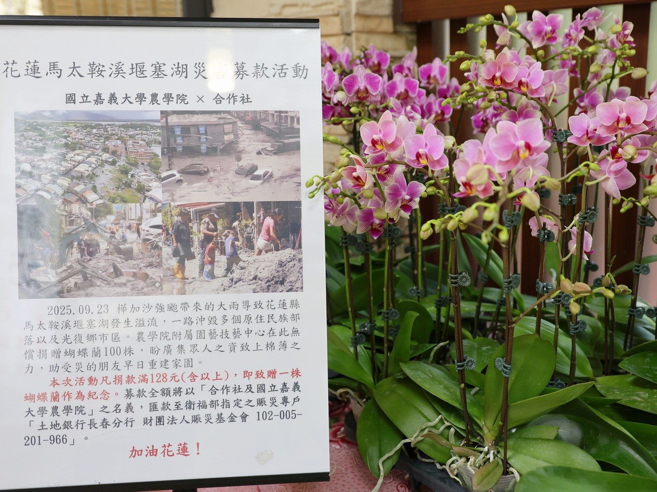 〔記者呂明鴻/嘉義市報導〕花蓮光復鄉馬太鞍溪堰塞湖日前發生溢流,造成光復鄉重大傷亡及損失,全民同表悲痛,嘉義大學農學院園藝技藝中心與動物試驗場為積極響應花蓮賑災愛心捐款,無償捐出100株蝴蝶蘭與66瓶嘉大鮮乳,攜手熱心公益的嘉大員生消費合作社作為認捐平台,即日起歡迎至合作社捐款滿128元即可領取1株蝴蝶蘭作為紀念,或認購1瓶嘉大鮮乳合作社即捐出90元,希望匯聚各方愛心,緩洪災之急難。