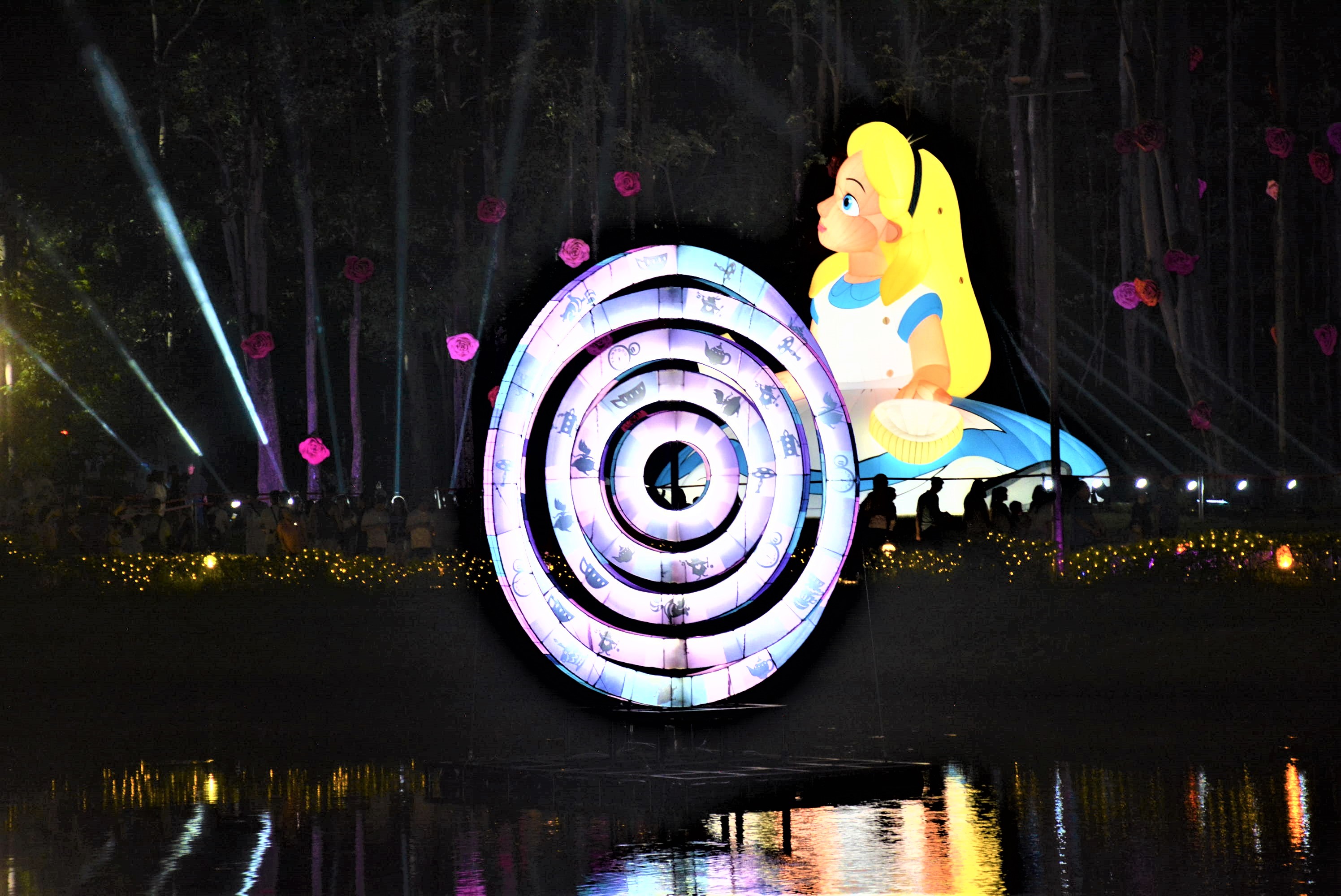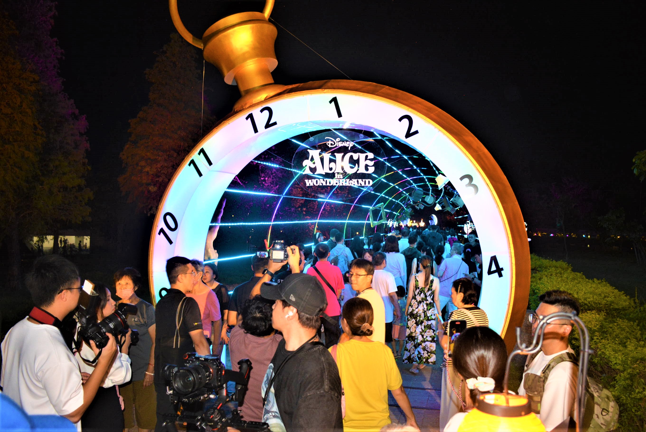 〔記者郭政隆/嘉義市報導〕嘉義市2025光織影舞光影藝術展,10/4日晚間於北香湖公園正式展開,今年以「光影夢境」為主題,結合迪士尼經典動畫「愛麗絲夢遊仙境」,打造8大沉浸式展區,讓每位遊客宛如置身光影魔法世界,每個角落也都成為拍照打卡的熱門景點,現場不僅有亞洲知名幻術師與重量級歌手輪番演出,更有9米高愛麗絲造型立體裝置和北香湖上4.5米高旋轉月亮裝置點綴夜空,將整個場景打造得夢幻迷人、充滿奇幻魅力。