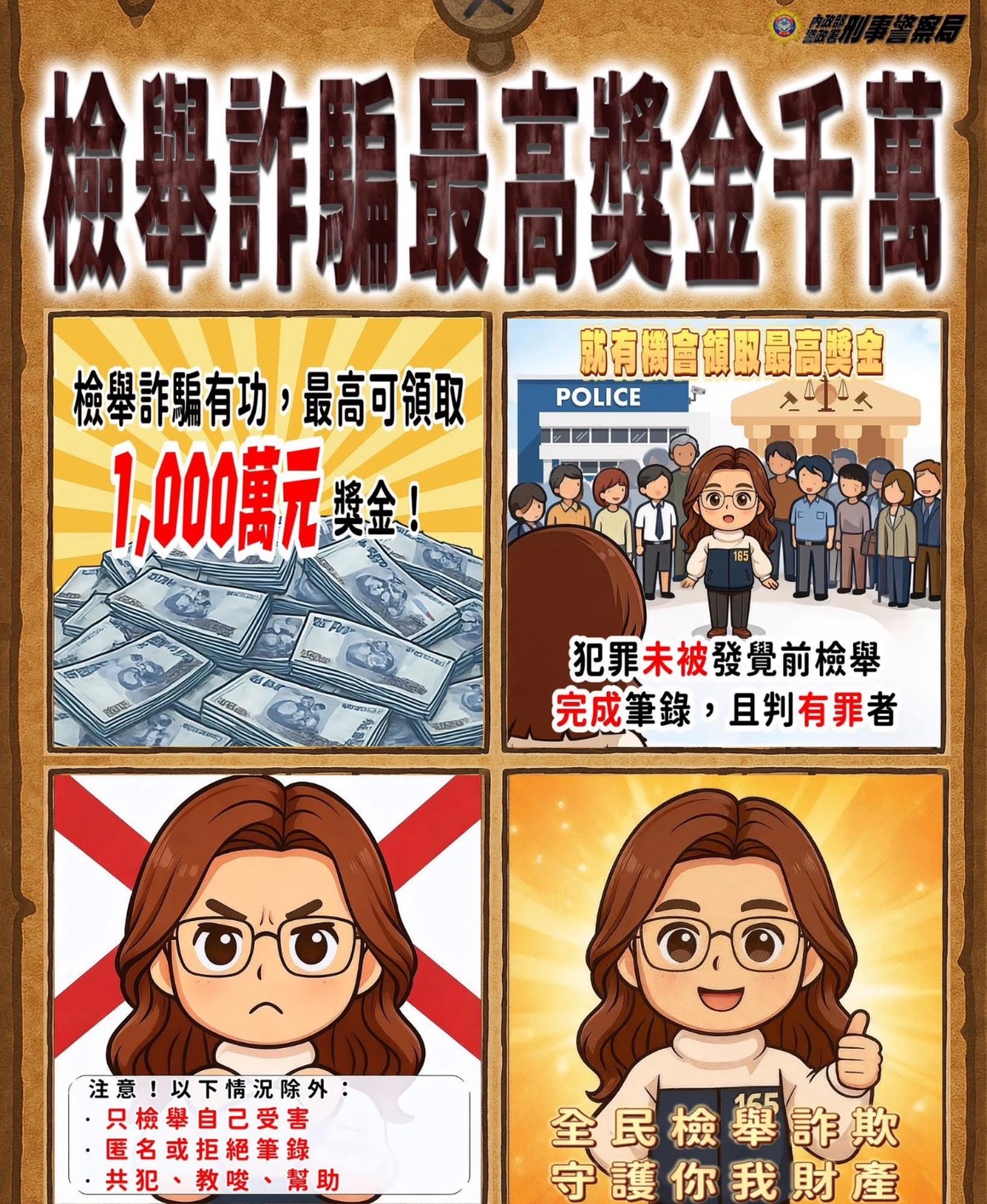 檢舉詐騙,最高領千萬!想當現實版「柯南」嗎? 內政部最新規定,只要你在詐騙犯被抓包之前,主動檢舉+做筆錄,案件最後判刑三年以上,就有機會領獎金~最高 1,000萬元! 不過要注意,以下情況均不在獎勵範圍內: 被害人僅就自身案件檢舉 匿名或拒絕筆錄、參與犯罪、教唆或幫助他人換句話說: 檢舉詐騙 = 賺獎金 + 救荷包 + 英雄一枚 不只保護自己,還能守護家人朋友的財產安全,一起變成全民防詐小尖兵! 詳細辦法條文可上行政院公報資訊網查詢。