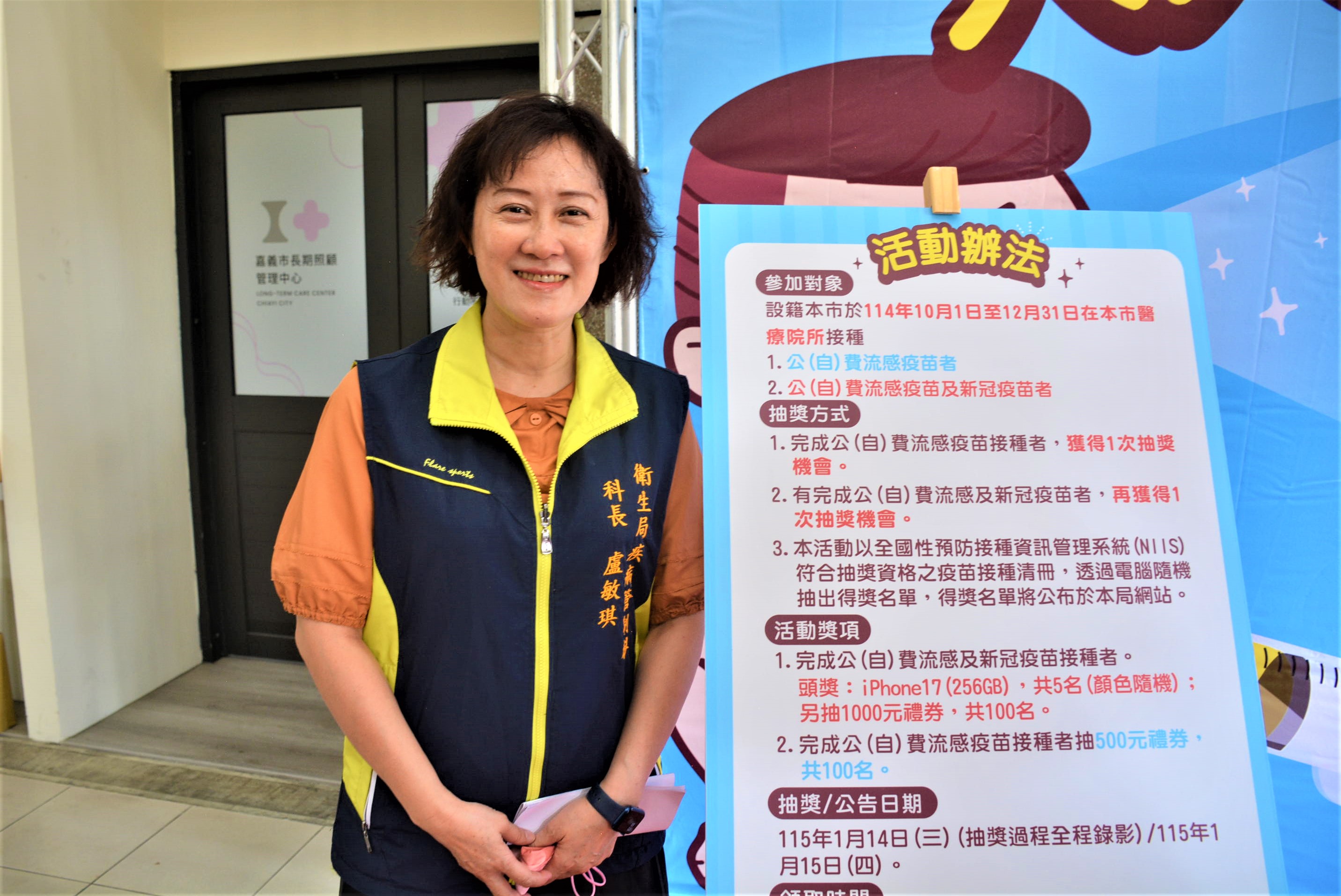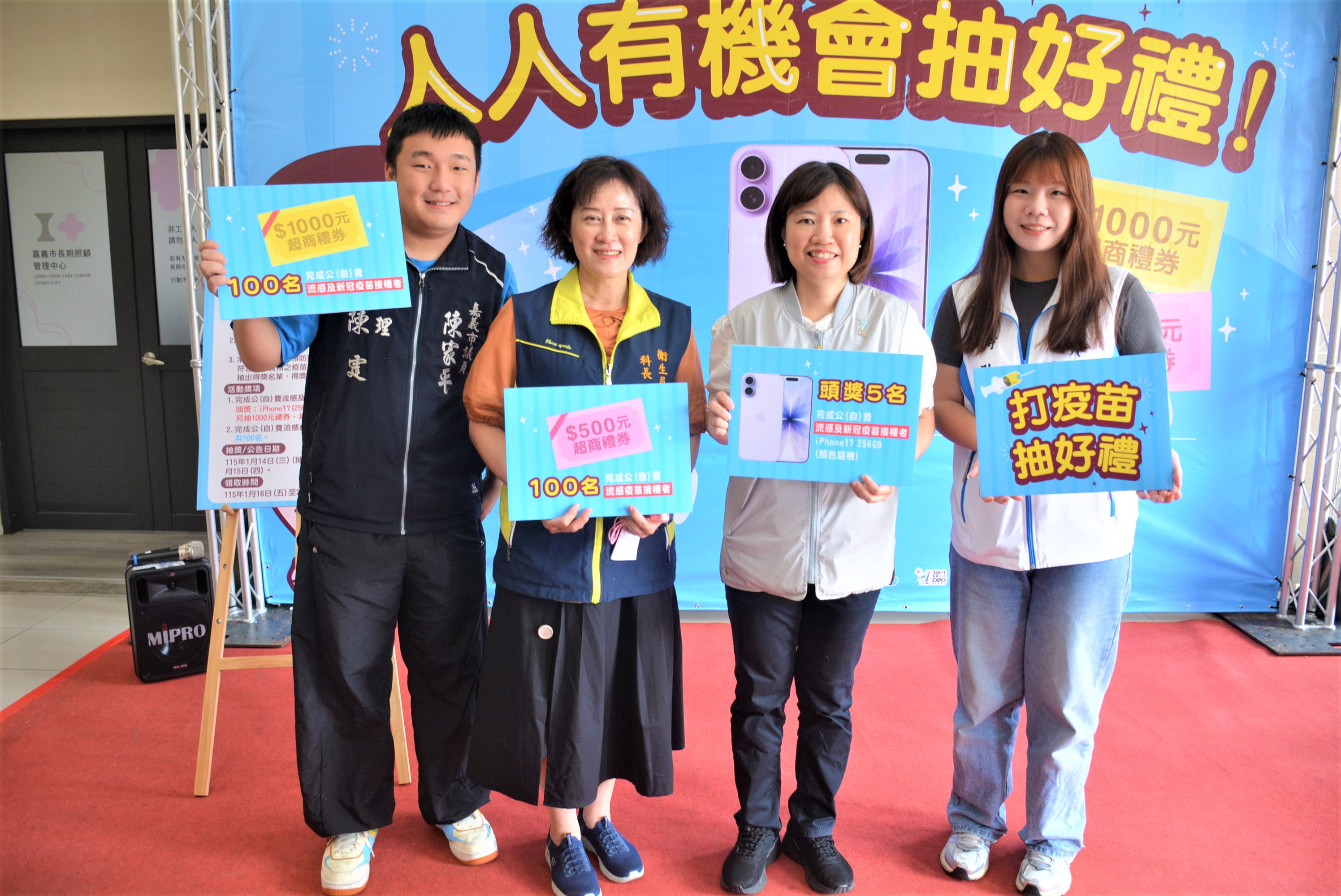 嘉義市衛生局廖育瑋局長說明指出,設籍嘉義市市民於114年10月1日至114年12月31日期間,在嘉義市醫療院所及學校及社區接種站接種公(自)費流感疫苗及新冠疫苗者最多可獲得2次抽獎機會,完成公費或自費流感疫苗接種者,可獲得500元超商禮券1次抽獎機會,共100個名額;若在活動期間,完成公費或自費流感及新冠疫苗接種者,可再獲得1次抽獎機會,頭獎為iPhone 17手機共5名(顏色隨機),未獲頭獎的民眾可再抽1,000元超商禮券共100名;今年度民眾接種疫苗情形相當踴躍,呼籲符合公費資格且尚未接種之民眾,儘速前往疫苗合約醫療院所接種,不僅獲得免疫保護力,還有豐富大獎。