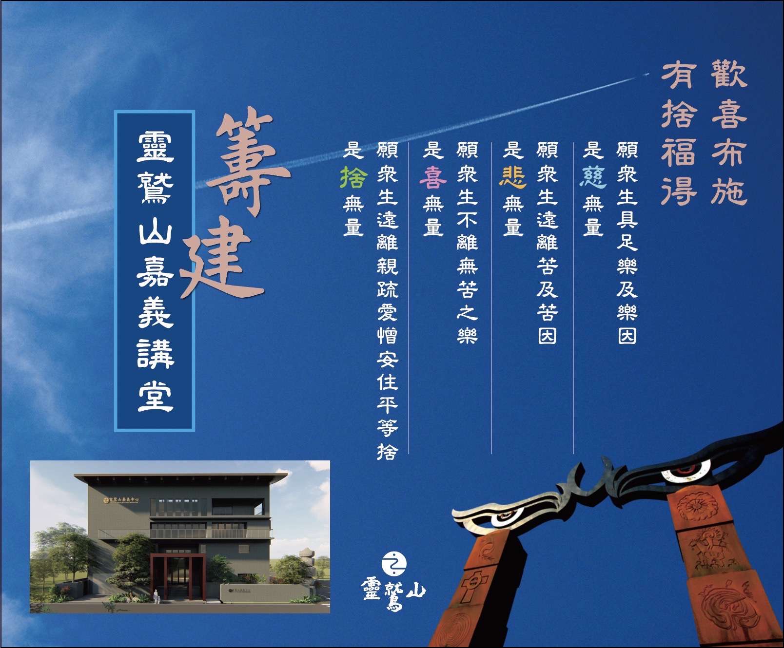 靈鷲山以「以靜為本、以戒為師、以行為體、以願為力」為修行核心,由出生緬甸的心道法師於1983年創建,總本山位於新北貢寮區,面臨太平洋、背倚山林,是一處結合禪修、佛法教育與自然生態的道場;而靈鷲山嘉義中心已在嘉義深耕20多年,常舉辦法會、平安禪修、經典共修、社教講座等,教務蓬勃,原嘉義市吳鳳北路現址不敷使用,現於湖子內順興二路與興美二路交叉路口,籌建地下一樓、地上五樓的嘉義講堂,預計116年竣工。
