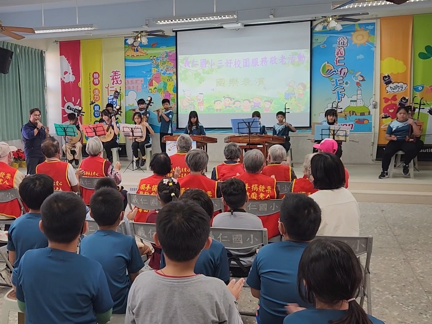 自106年開始的獨老音樂會,是義仁國小服務學習的特色之一,孩子們為阿公阿嬤演出耳熟能詳的歌謠,藉音樂撫慰長者的心靈;活動先由高年級生的國樂演出,以熱鬧樂曲帶動現場的氣氛,接續由低年級的活力舞蹈上場,帶動阿公阿嬤們一起揮手做運動,從孩子的活潑與笑容中溫暖每一位長者的心靈;表演最後由直笛隊帶來了今年榮獲嘉義縣音樂比賽優等第二名的曲目,悠揚的旋律中展現的是義仁國小在音樂教育與學生才藝發展的成果。