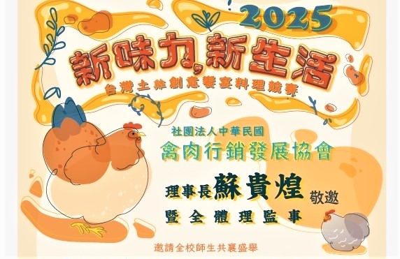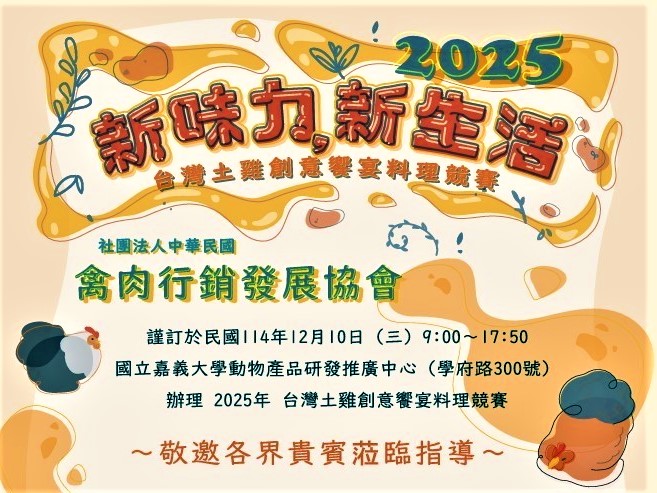 〔記者侯姵伃/嘉義市報導〕為推廣國產土雞產業、提升社會大眾對土雞料理的認識與喜愛,由農業部指導、中華民國禽肉行銷發展協會主辦、嘉義大學動物科學系執行的2025年臺灣土雞創意饗宴料理競賽「新味力・新生活」,12月10日將在嘉大蘭潭校區動物產品研發推廣中心前盛大舉行。活動匯聚全臺高中職與大專校院的料理選手,更邀集多家知名土雞品牌及食品企業共同參與,打造一場結合創意競賽、品牌市集與土雞文化推廣的年終美食盛典。
