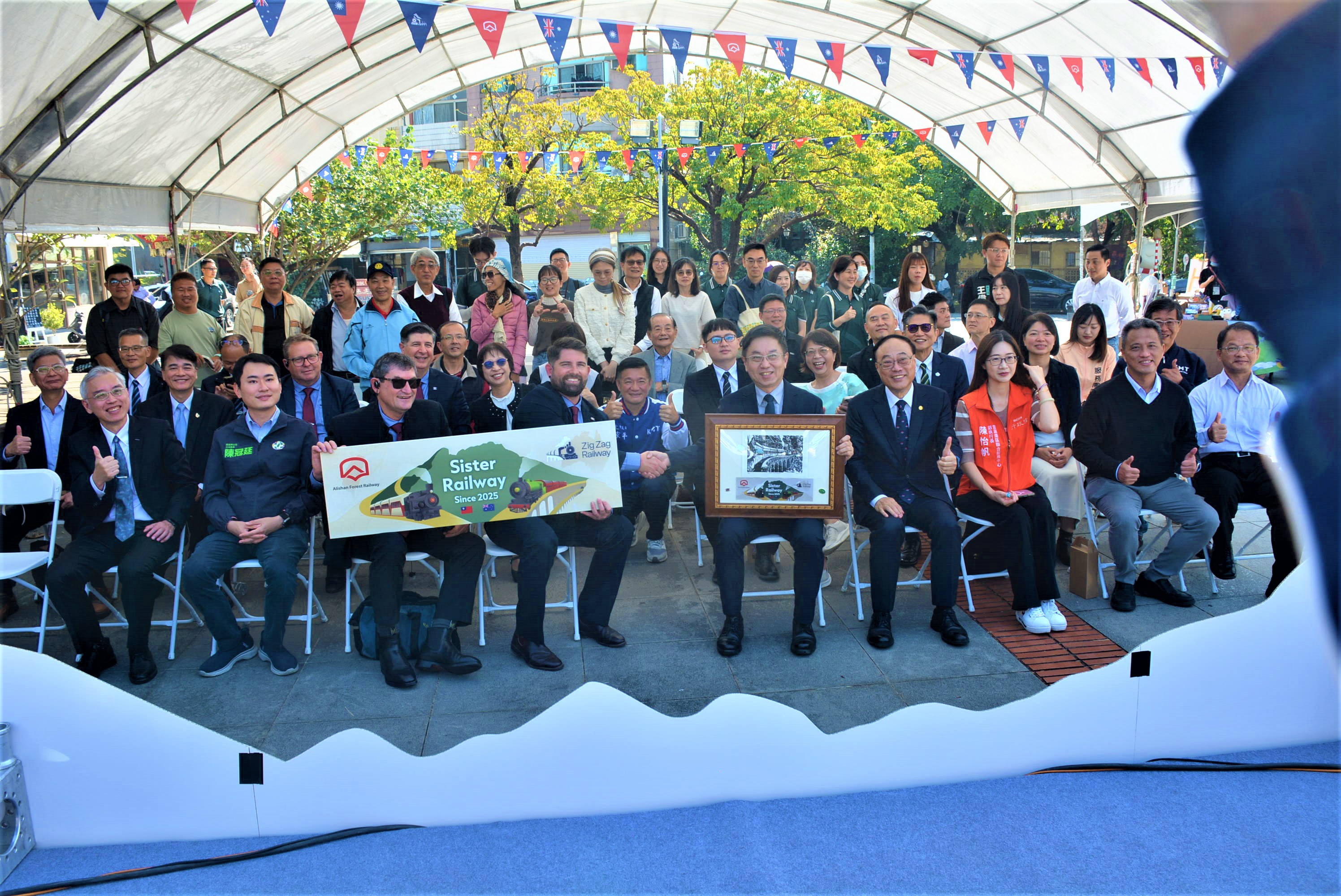 今日出席活動的嘉義市議員陳家平也表示,阿里山林業鐵路不僅是台灣珍貴的文化遺產,其獨特的登山工法與歷史意義更是享譽國際,此次與同樣具有百年歷史、以艱難的之字型路線著稱的澳洲之字型鐵路結盟,象徵著雙方在鐵道技術與文化觀光上的深度交流與合作;今天姐妹鐵路的締結將有助於提升阿里山林鐵的國際能見度,並共同推動全球林業鐵道文化的保存與永續發展,為兩地的觀光帶來新的契機。期待未來能有更多實質交流,讓兩條百年鐵路的歷史光輝持續閃耀。