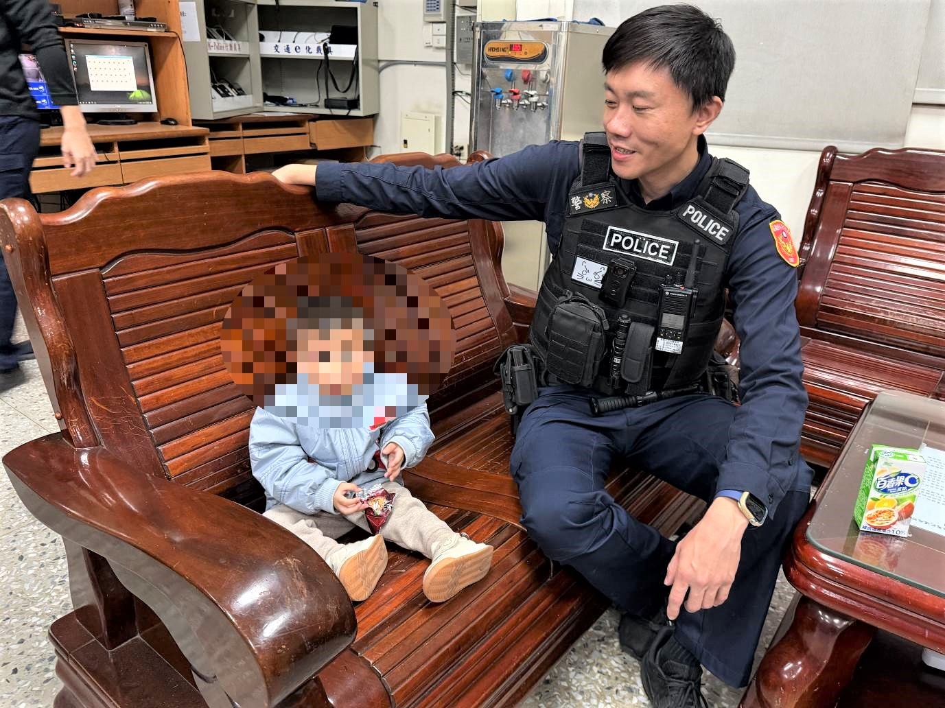 員警抵達幼兒園後,先了解孩童基本狀況,並安撫情緒,由於時間已近傍晚且幼兒園即將關閉園區,員警決定先將孩童帶回派出所暫時照顧,員警以溫馨關懷與孩童聊天,安撫男童緊張害怕情緒,隨即循線查詢家長聯絡方式,並持續撥打多通電話。