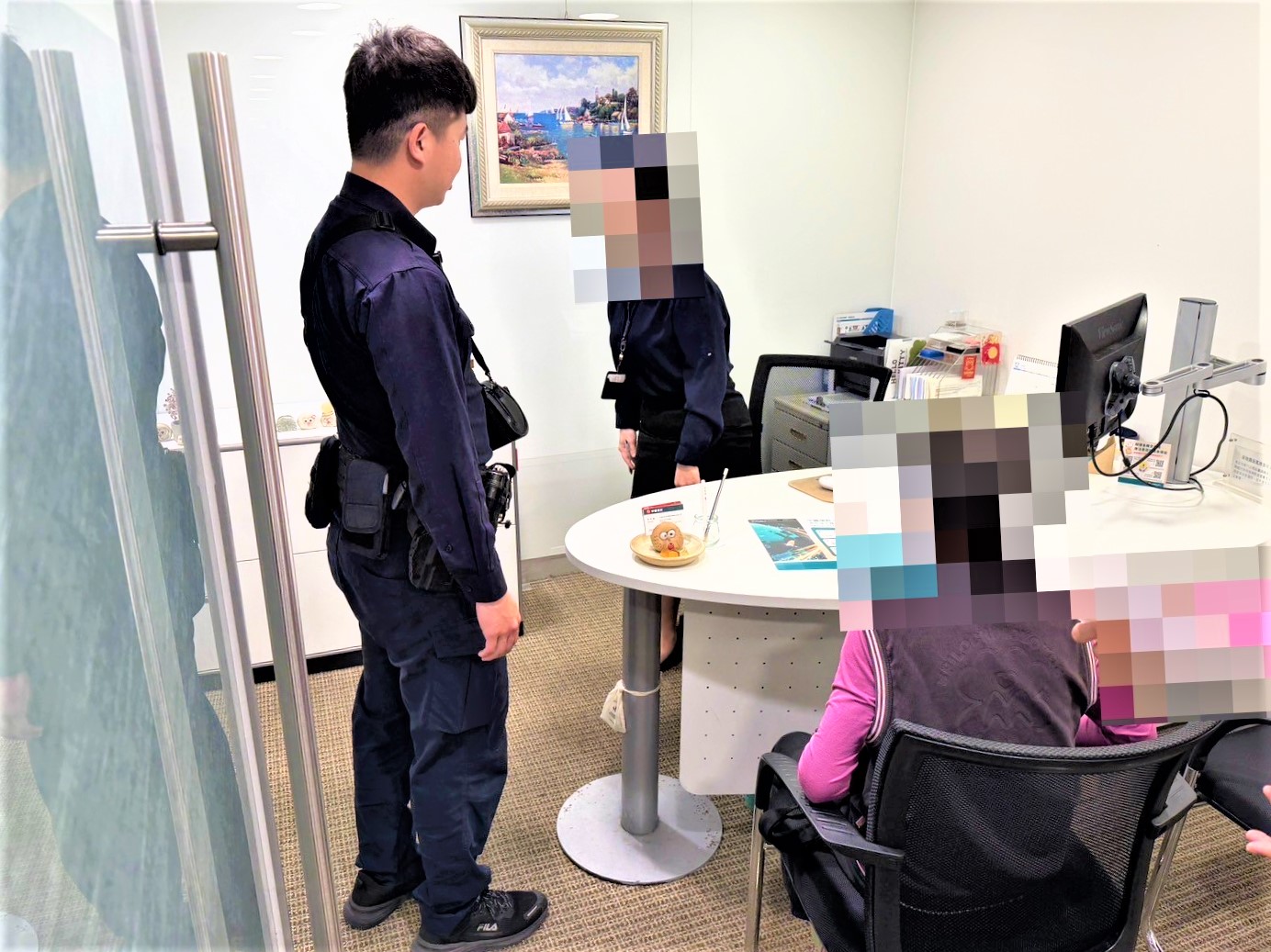 經到場關懷詢問得知為77歲陳姓婦人,陳婦面對警方提問時,神情慌張面露難色,無法正確說明提領的原因,陳婦表示要提領現金是要提供給女兒修繕房屋,惟陳婦一直無法提供相關對話紀錄及證明,亦說不清楚具體的整修內容,加上無法撥打電話給女兒確認,員警為了防範遭遇詐騙情事,只好持續關懷深問,希望陳婦放下戒心。