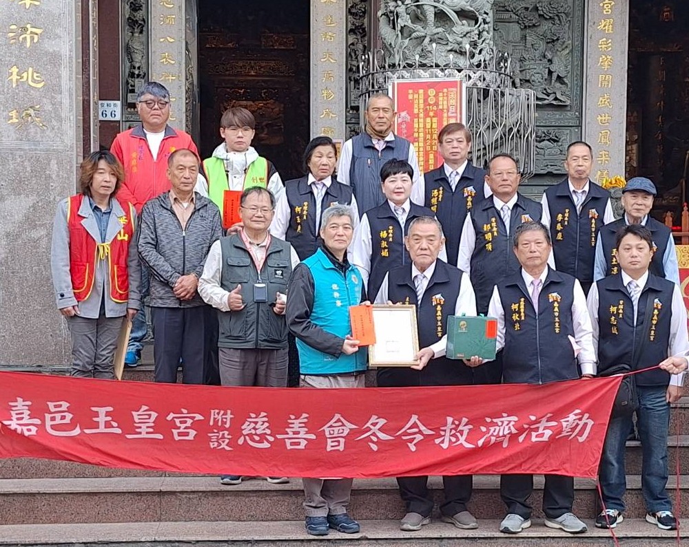 〔記者侯姵伃/嘉義市報導〕嘉邑玉皇宮為關懷弱勢族群、發揮宗教慈悲濟世精神,12/14日舉辦「冬令救濟」活動,捐贈善款及民生物資予嘉義縣、市多個社會福利單位,實際將愛心送到需要幫助的民眾手中;其中,嘉義榮民服務處亦獲贈善款,由總幹事許家豪代表受贈,並致贈感謝狀,感謝玉皇宮長期支持榮服處推動退除役官兵眷服務照顧工作。
