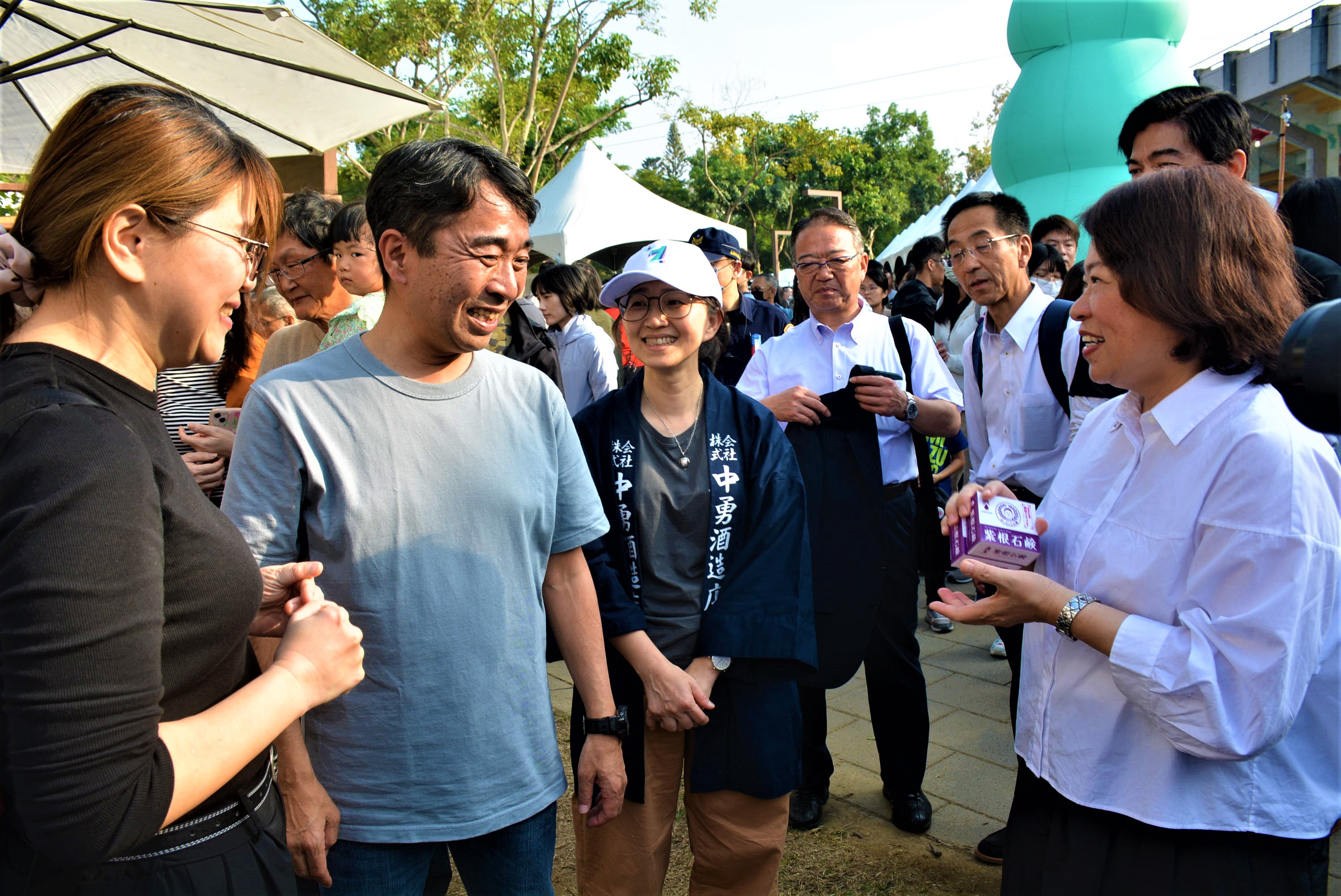〔記者郭政隆/嘉義市報導〕日本宮城縣加美町長石山敬貴、加美町議長味上庄一郎與嘉義市互訪往來密切,今年嘉義市國際管樂節期間,加美町再度到訪,交流團一行共18人,參訪團一行除再次參與管樂節相關活動,12/21日也參與位於嘉義公園舉辦的「開嘉市集」設攤,販售當地自產清酒及工藝品,透過多元交流方式,進一步展現嘉義市與加美町互動合作的成果與活力。