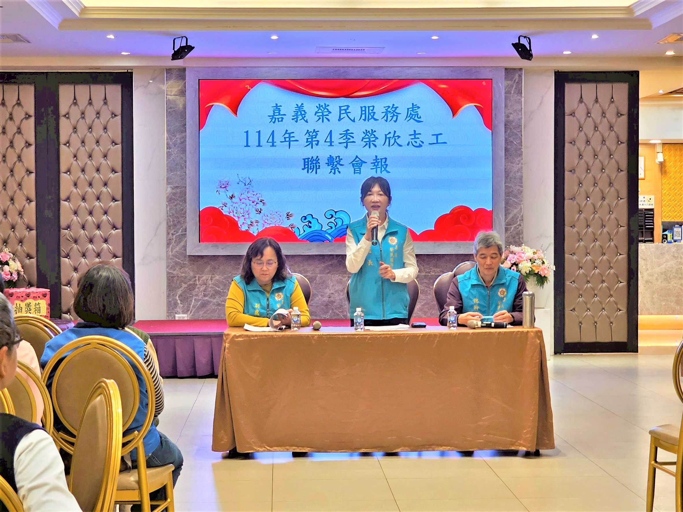 〔記者呂明鴻/嘉義市報導〕嘉義榮民服務處日昨舉辦「114年度第4季志工聯繫會報暨感恩聯誼會」,由處長許淑菁主持,邀請志工(榮譽)顧問及70餘位榮欣志工共襄盛舉,藉由交流分享與感恩餐敘,感謝志工長期無私付出,凝聚團隊向心力;會中,許處長頒發退輔會前主任委員董翔龍上將等4位志工榮譽顧問,以及李啟仁先生等4位志工顧問聘書,期盼藉由顧問專業經驗與資源挹注,持續強化嘉義榮服處志工服務量能。