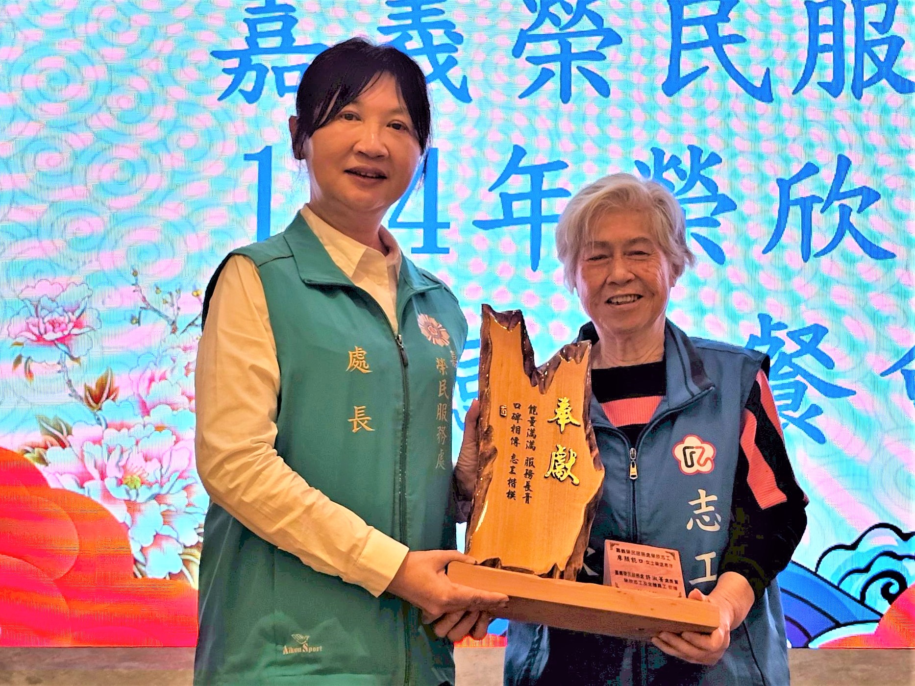 活動中並頒贈年滿80歲、服務逾20年的顏大姊榮退紀念獎座,感謝其長年協助嘉義榮服處志工服務工作;另表揚志工凃大姊榮獲衛福部志願服務績優銅牌獎,肯定其服務表現。