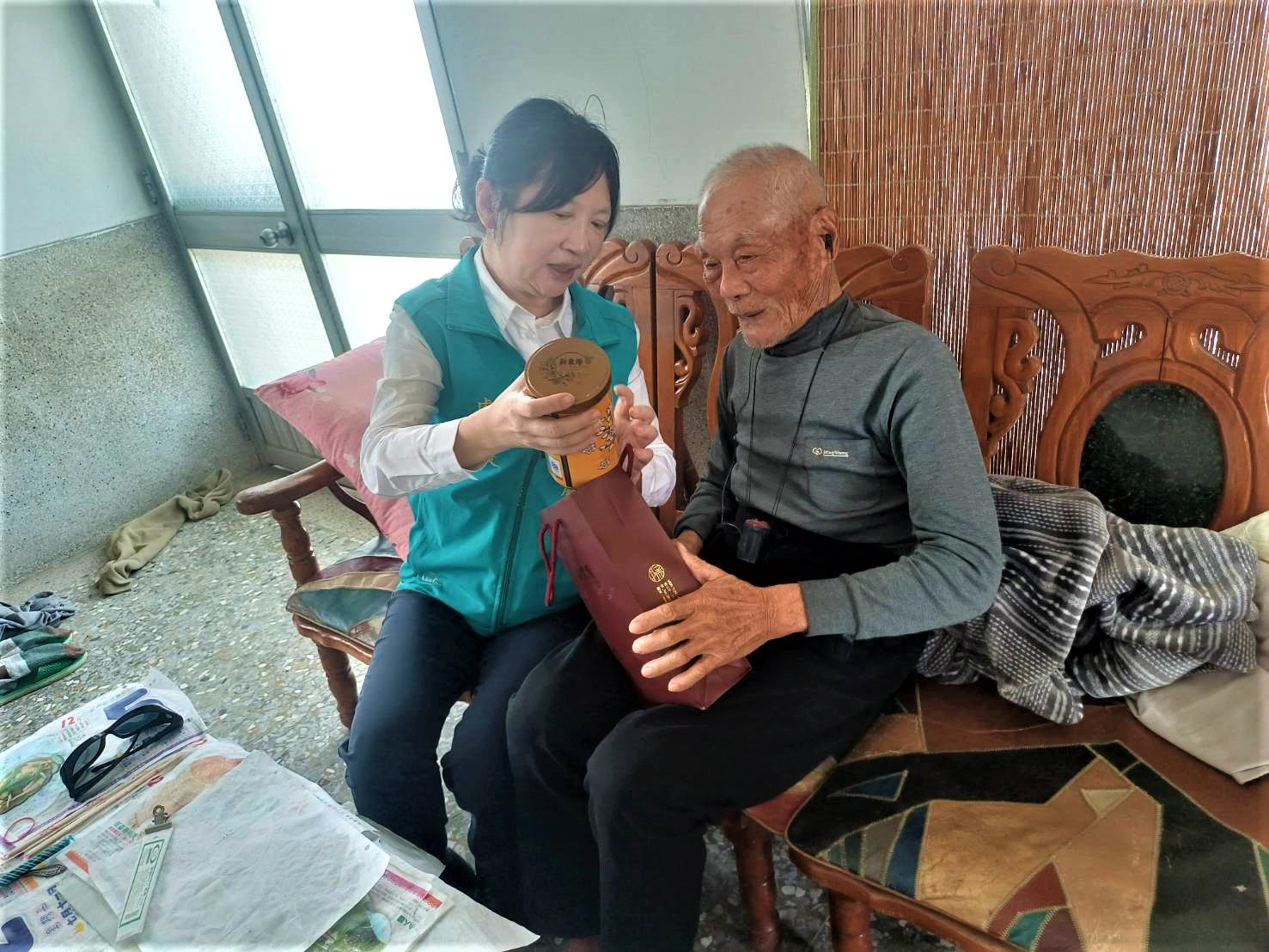 許處長訪視年長呂姓榮民時,除了與長輩話家常外,也致贈肉鬆,希望長輩早上吃粥暖呼呼時,也能營養均衡心暖暖,隨後許處長在社區服務組長的陪同下,到另一位呂姓長輩的家中,除了關心長輩衣著保暖外,呂姓長輩也與處長分享生活照片與狀況,因冬天容易皮膚乾裂,長輩皮膚特別薄更須小心注意,因此許處長致贈乳液,希望長輩注意自己身體狀況。