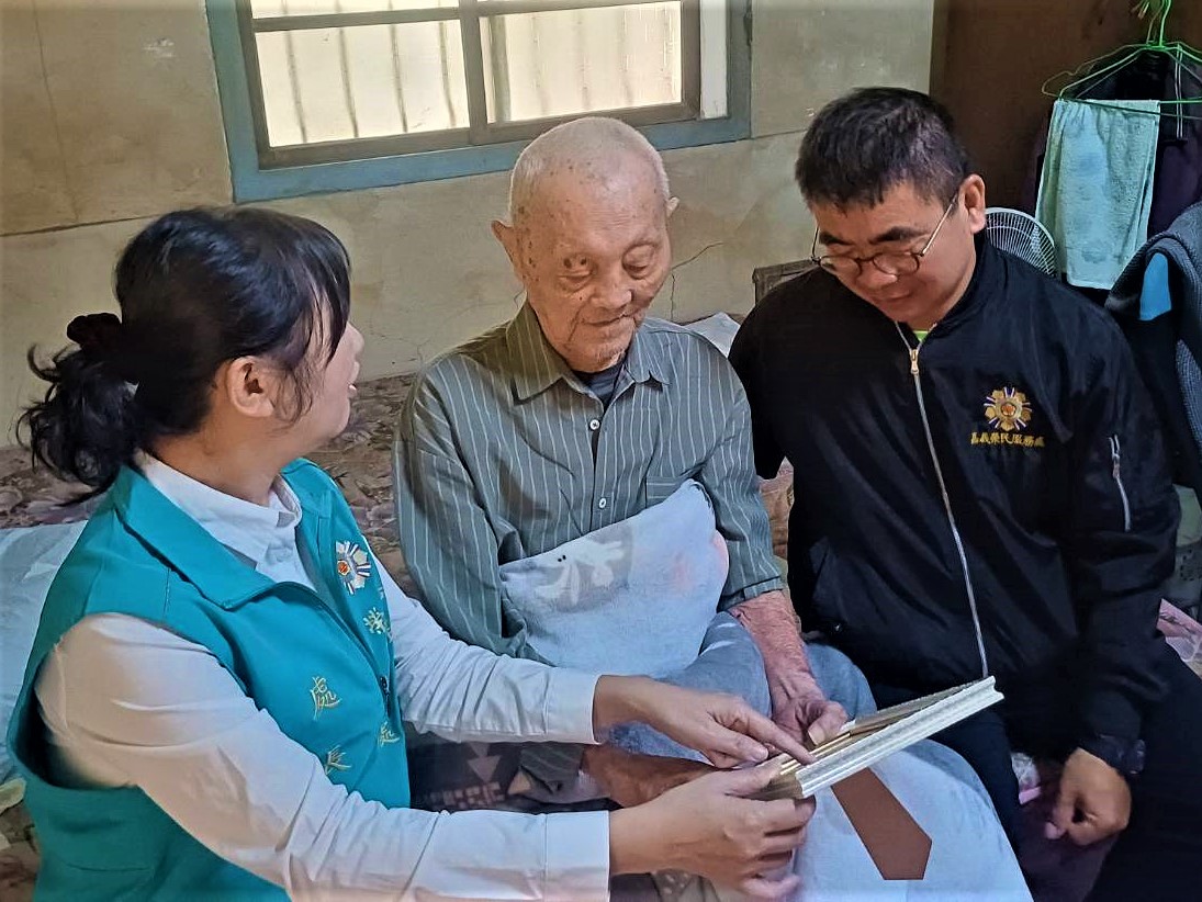 接著許處長來到行動不便的沈姓榮民家中,關心沈姓長輩受照顧狀況,並致贈毛巾被讓長輩能注意保暖,許處長也特別叮嚀這些長輩們早暖溫差大,千萬別因白天看到太陽溫暖,就忽略了夜晚保暖,更叮囑用電(火)安全與住宅通風,這些貼心叮嚀都讓榮民長輩倍感窩心與揪甘心。