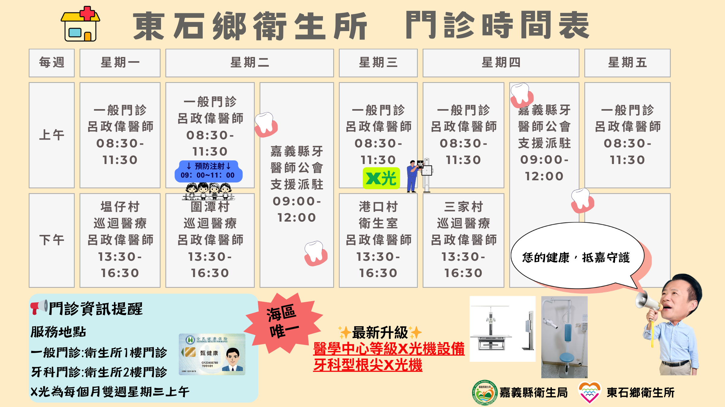 衛生局長趙紋華說明,為造福偏鄉及醫療資源缺乏地區民眾,衛生局整合各鄉鎮市衛生所每月提供3+1巡迴醫療服務,包含婦女保健專車及醫療服務專車,每月巡迴各鄉鎮不同村里,其中醫療服務專車配置有數位化X光設備及專業放射師,此次東石衛生所獲贈新穎X光設備於門診固定服務,結合社區醫療服務專車之X光服務,提供民眾更多樣性選擇,以更靈活的照護方式完善偏鄉地區的不足,讓服務更貼近鄉親的需求。