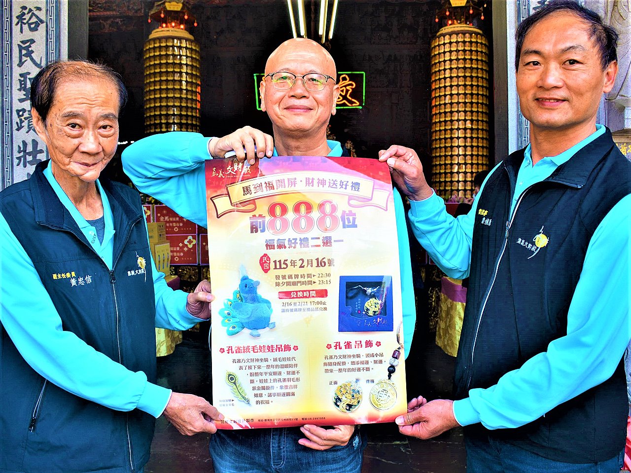 嘉義文財殿文任委員吳憲育說明表示,嘉義市政府一直在推新的文創,並希望在文創產物上能多做實用又可以吸引新的年輕族群;文財殿今年除有發財金,還有文創上的孔雀吊飾及孔雀絨毛娃娃,今年除夕夜,文財殿不搶頭香,但會提供888位文創禮,只要來拜頭香,就有孔雀吊飾及孔雀絨毛娃娃兩種讓民眾來選擇,孔雀絨毛娃娃可讓1年的財氣充滿喜氣,孔雀吊飾可別於包包隨身攜帶,比較經濟實用,這些文創產物都有經過加持;另外,那我們今年的活動一樣,在農曆初一到初五都有借發財金,歡迎全國各地的信眾都能夠來借發財金,讓財氣活絡、順風順水。