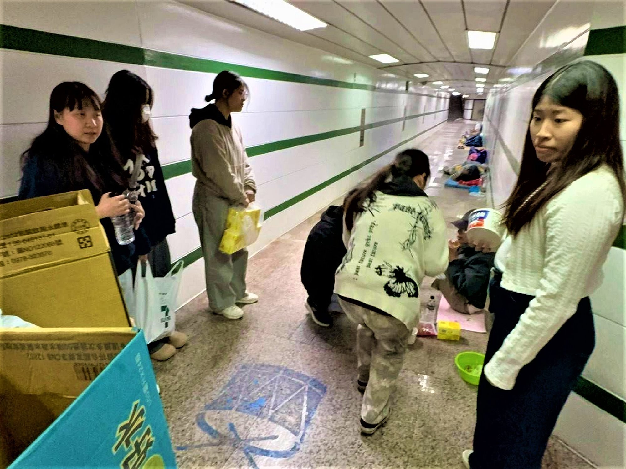 嘉義火車站前人潮絡繹不絕,是城市重要門面,同時也是部分弱勢族群暫時棲身之處,此次行動由生死學系社工組助理教授蔡長穎帶領學生團隊,在寒風中主動關懷露宿者與經濟弱勢民眾,並逐一發送棉被、防寒用品與熱湯餐食,更透過簡單的問候與傾聽,了解他們背後的生命故事與生活處境。