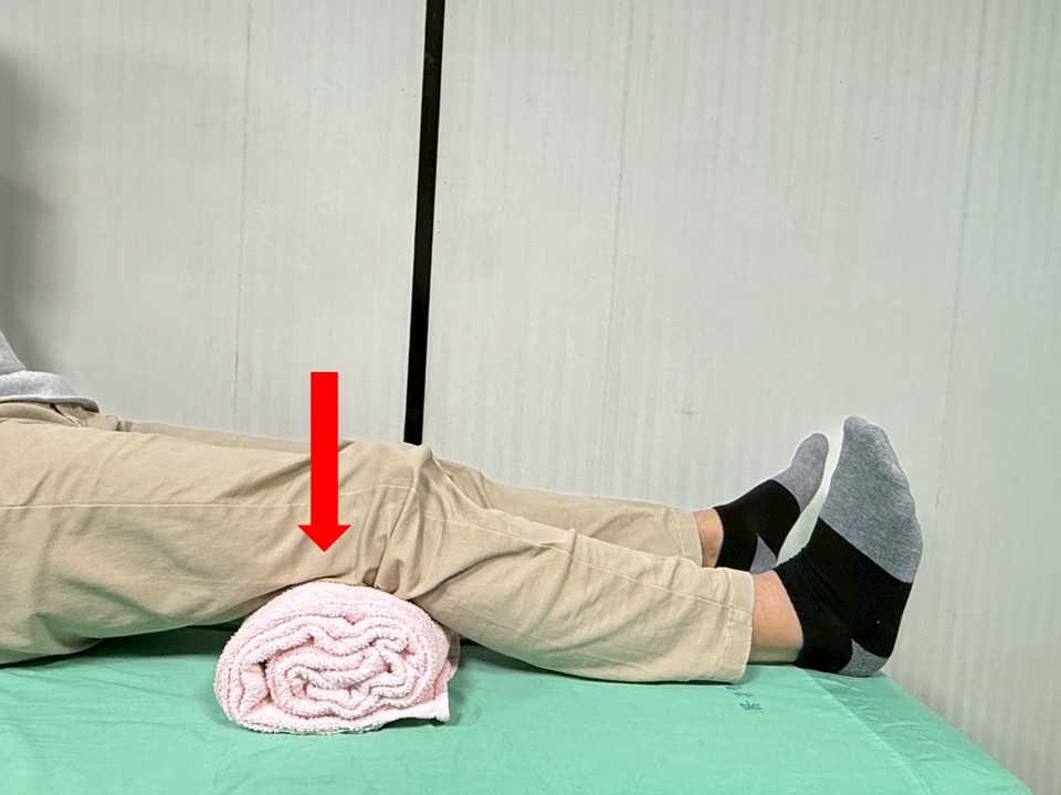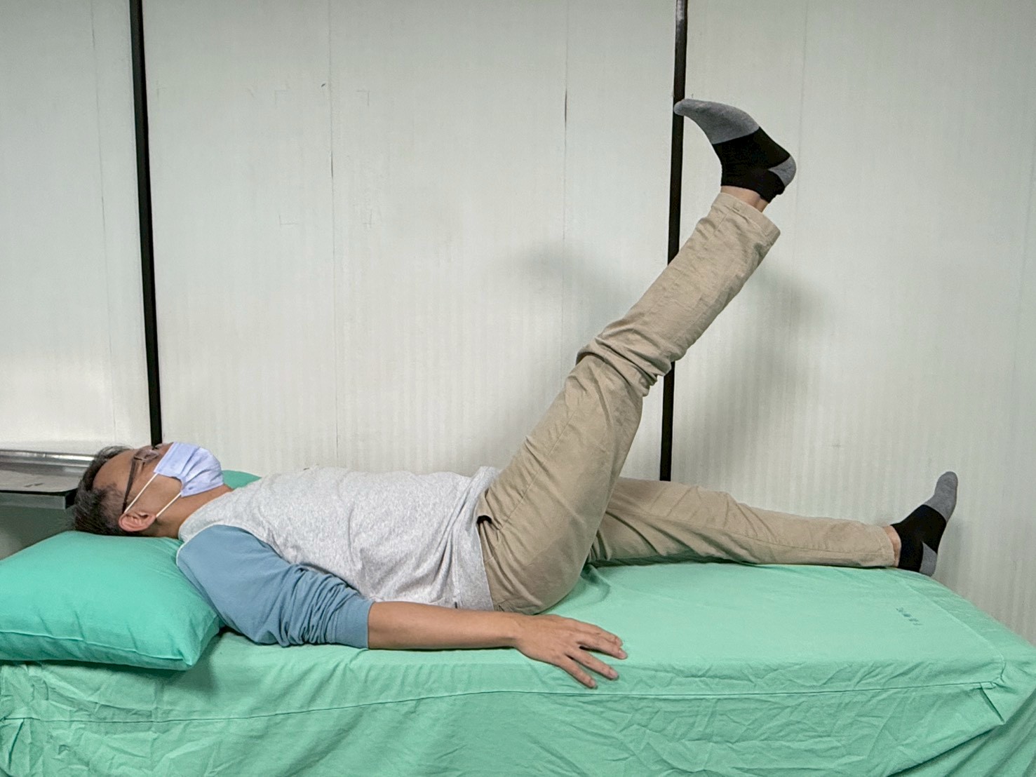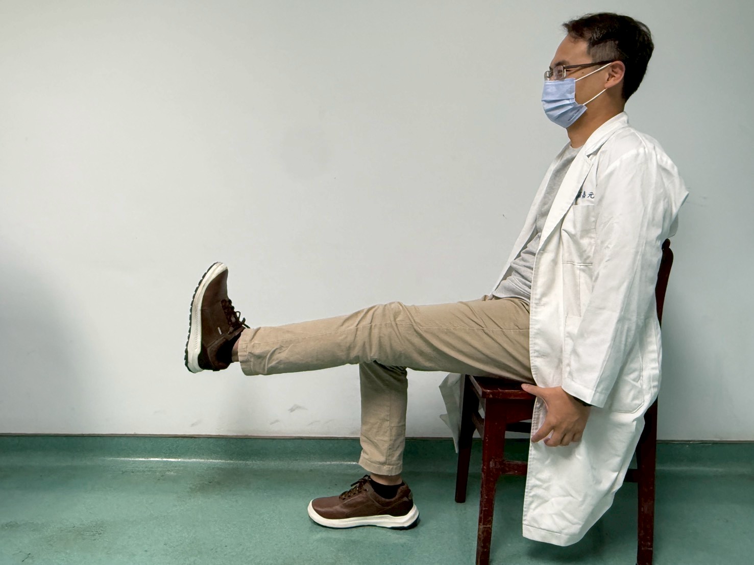 「坐姿抬腿肌力運動」:坐在平穩的椅子上,左、右腿輪流伸直抬高,足部勾起,維持用力10秒,輪流做10次;無法久坐的患者可以採取「平躺抬腿肌力運動」:平躺在床上,大腿伸直抬高45度並足部勾起,維持用力10秒,左、右腳輪流做10次;「壓毛巾肌力運動」:平躺在床上,在膝關節下方墊一個毛巾捲,大腿用力將毛巾捲往下壓維持10秒後放鬆,雙腳輪流做10次。