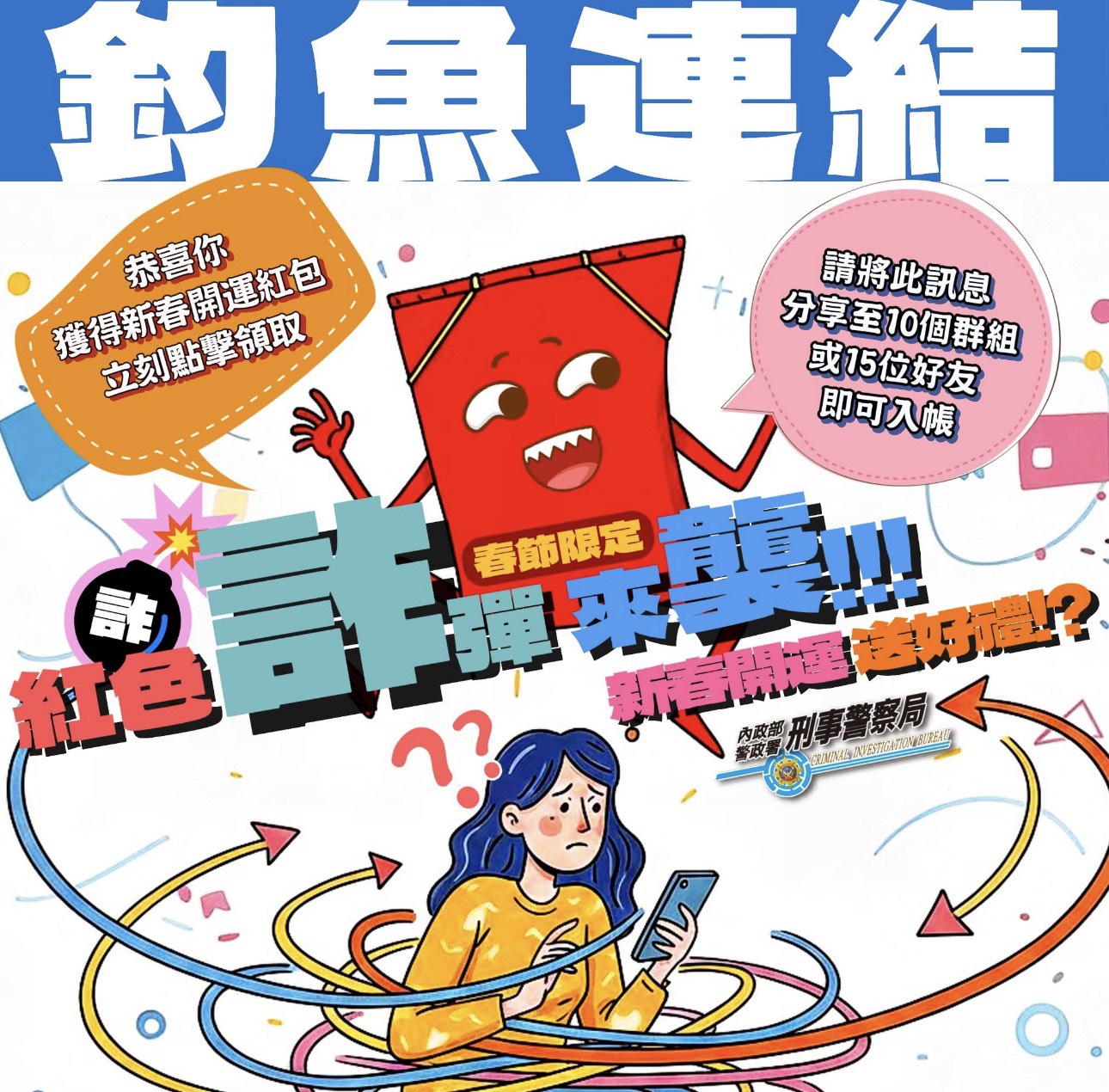 新春紅包詐騙手法曝光:恭喜你!獲得新春開運紅包500元,立刻點擊領取。 每逢春節期間,LINE群組或臉書社團常出現這類訊息,當你點擊連結後,隨即要求填寫個人資料(身分證字號、手機門號、銀行帳號、信用卡卡號及驗證碼),並分享訊息至10個群組或15位好友,才能入帳;一旦你的資料外洩,恐遭盜刷、盜領或冒名申辦貸款,造成財務損失。這就是典型的「熟人信任」詐騙手法!藉由民眾轉傳,擴散釣魚連結,增加可信度,引你進圈套! 請大家留意: 不明連結勿點擊、不明頁面勿填寫個資。 接獲可疑訊息,請先查證來源。 若發現疑似詐騙,請保留畫面並撥打165反詐騙專線諮詢或報警處理。