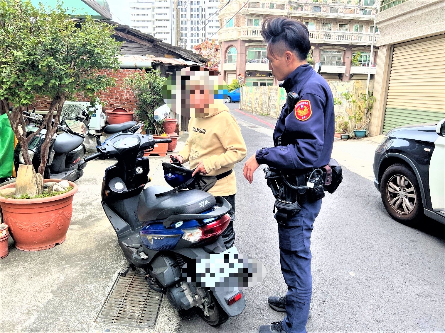 員警詢問所騎乘機車號為何,男子卻僅回答三碼數字,表示該機車為太太所有,查詢車號並調閱路口監視器資料,確認行經方向時,最後出現在五顯街與長安街口,之後均未再發現該車軌跡,員警研判機車可能停於附近,攙扶男子坐上巡邏車繞巡附近街道一起尋找。