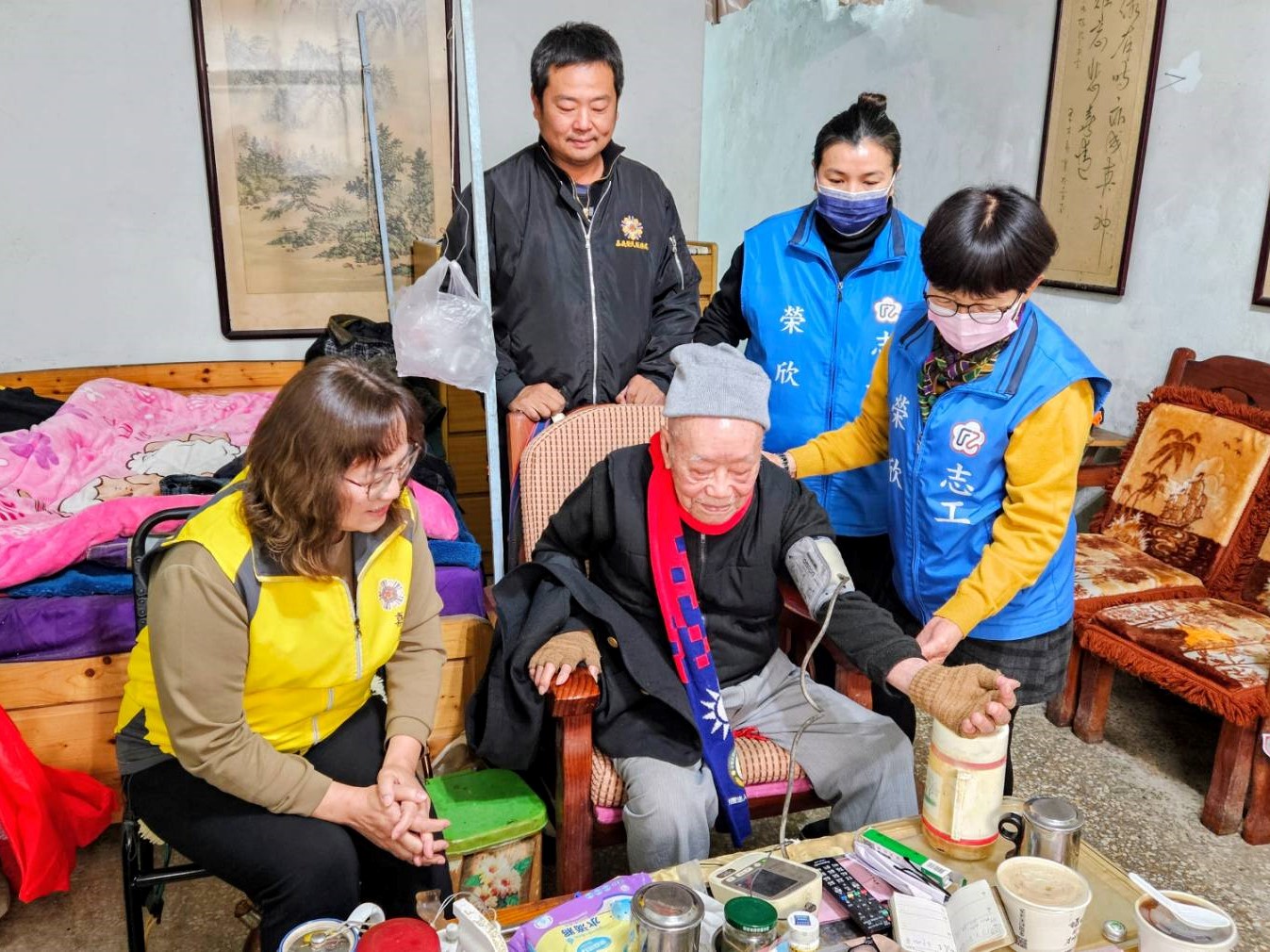 獨居且年事已高梁姓榮民長輩,近期常感頭痛不適,榮服處團隊到訪時,除主動關心其身體狀況,也貼心陪伴量測血壓,叮嚀長輩注意飲食、留意健康並適時就醫,展現細膩周到的關懷;另榮欣志工第四隊何隊長及志工嚴大姊帶著理髮工具,幫呂阿姨及其女兒剪髮,周大哥帶著割草機,到呂阿姨後院割草、整理環境,避免蚊蠅孳生,此外總幹事代表處長致贈呂阿姨1件毛毯,溫暖好過冬。