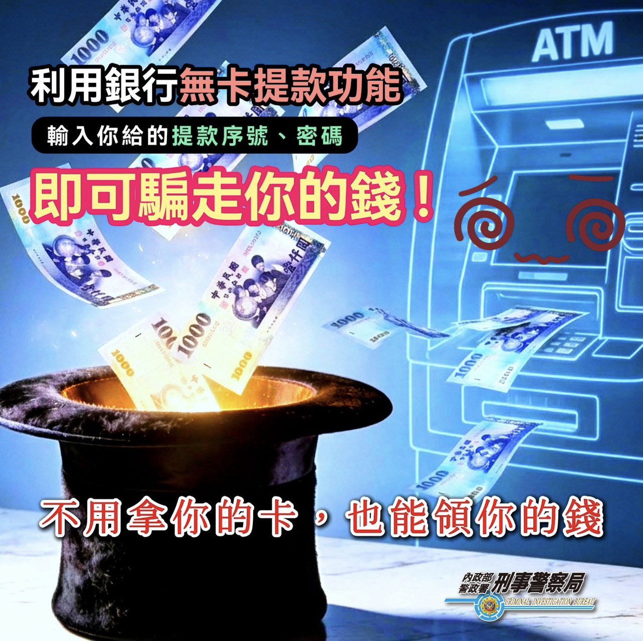 「無卡提款」竟成詐騙新寵?序號一給,錢秒領光!最近詐騙集團盯上了銀行的「無卡提款」功能! 這類詐欺手法多於網購詐騙,他們會謊稱「因交易造成帳戶異常或被凍結」,要求被害人立刻操作「無卡提款功能」,並提供「提款序號及密碼」,被害人一旦交出,車手在短短10至15分鐘內,就能領走你的錢財。 防詐重點: 無卡提款的序號與密碼 = 你的提款卡,若遇到要求提供「無卡提款序號及密碼」,百分之百是詐騙!