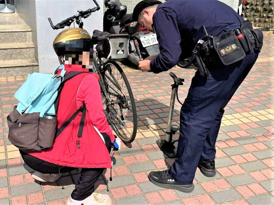 女子先是便尋找附近有無商家能幫忙灌氣,但因正逢假日,許多店家都沒有營業,女子一時不知該如何是好,這時見前方剛好有一間派出所,便上前詢問請求警方協助,警方了解事發經過後,遂於派出所拿出打氣筒,並協助替女子將自行車之輪胎充氣。