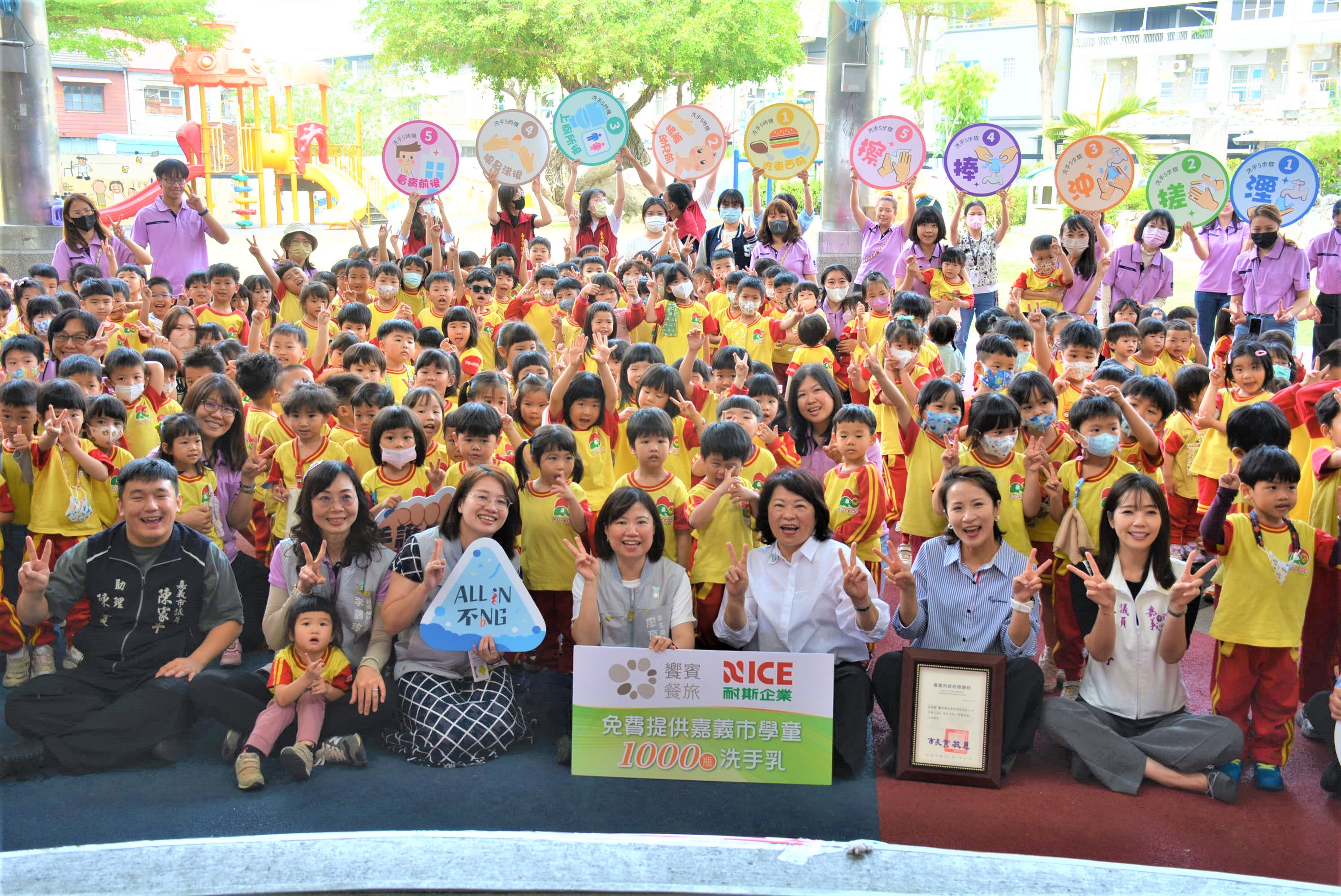 嘉義市長黃敏惠表示,3、4月為腸病毒流行高峰期,隨著氣溫回升,更需提高警覺並落實預防措施,防疫關鍵在於建立正確觀念並從教育扎根做起,特別感謝饗賓集團與耐斯企業長期投入公益,此次共同捐贈1,000瓶洗手乳,市府將分送至全市73所幼兒園,強化校園防疫量能;而預防腸病毒最有效的方法就是勤洗手,應落實「濕、搓、沖、捧、擦」五步驟及正確洗手口訣,並在用餐前後、如廁後、返家及進出醫療院所等時機確實清潔,呼籲家長共同培養孩子良好衛生習慣,讓「健康」成為送給家人最重要的禮物,攜手守護孩子的健康。