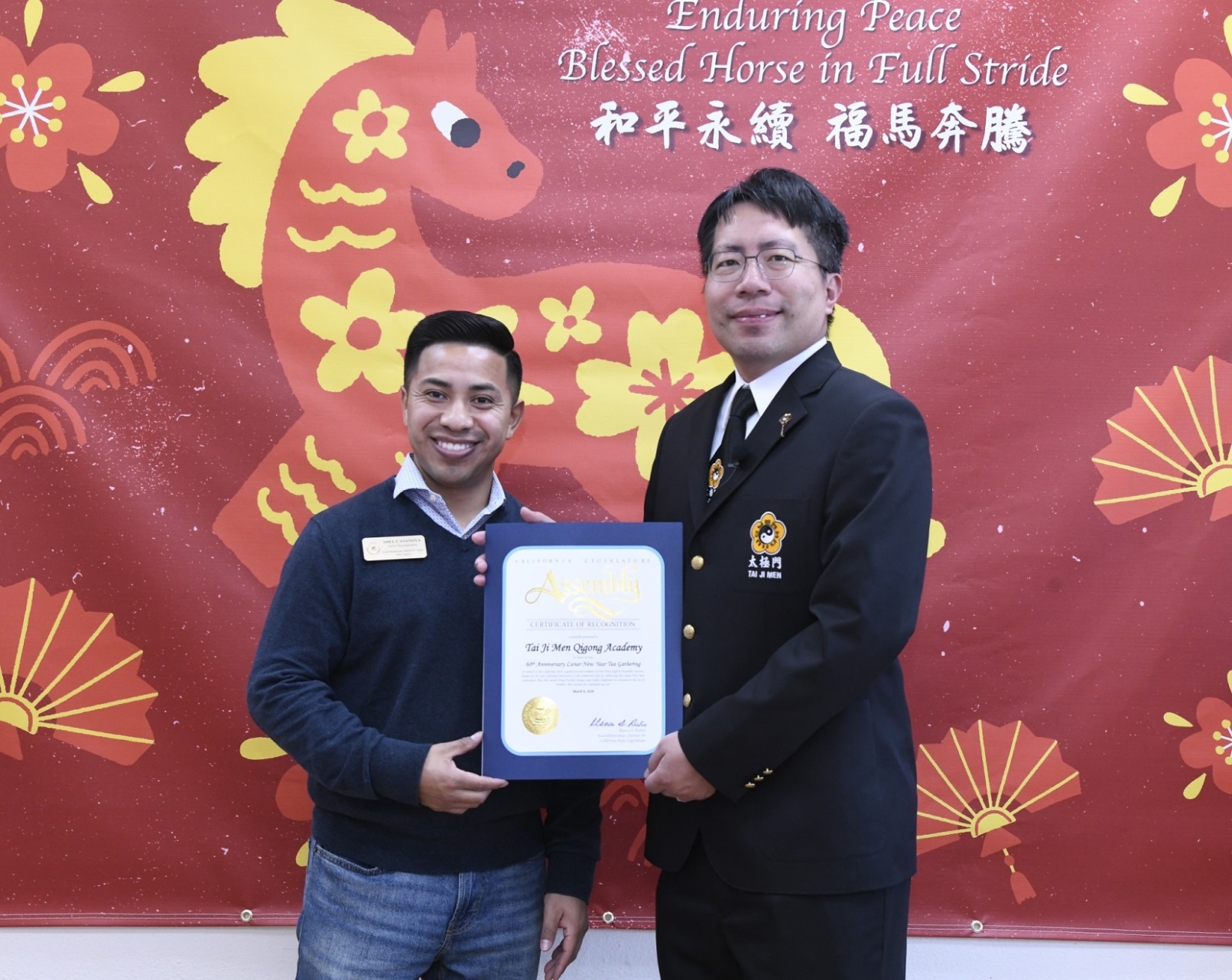 Abel Casanova代表加州州眾議員Blanca E. Rubio頒發表揚狀給太極門,感謝太極門持續為社區付出心力。鑽石吧市議員鄧嘉猷也代表市議會頒發表揚狀,表彰太極門對社區的奉獻與服務。此外,太極門也收到來自各界的祝賀與表揚。加州州眾議員Michelle Rodriguez透過表揚狀表示:「這項特別的慶祝活動展現了對文化傳統與社區團結的深刻承諾。」她並感謝太極門持續服務及貢獻社區,帶來正向影響。