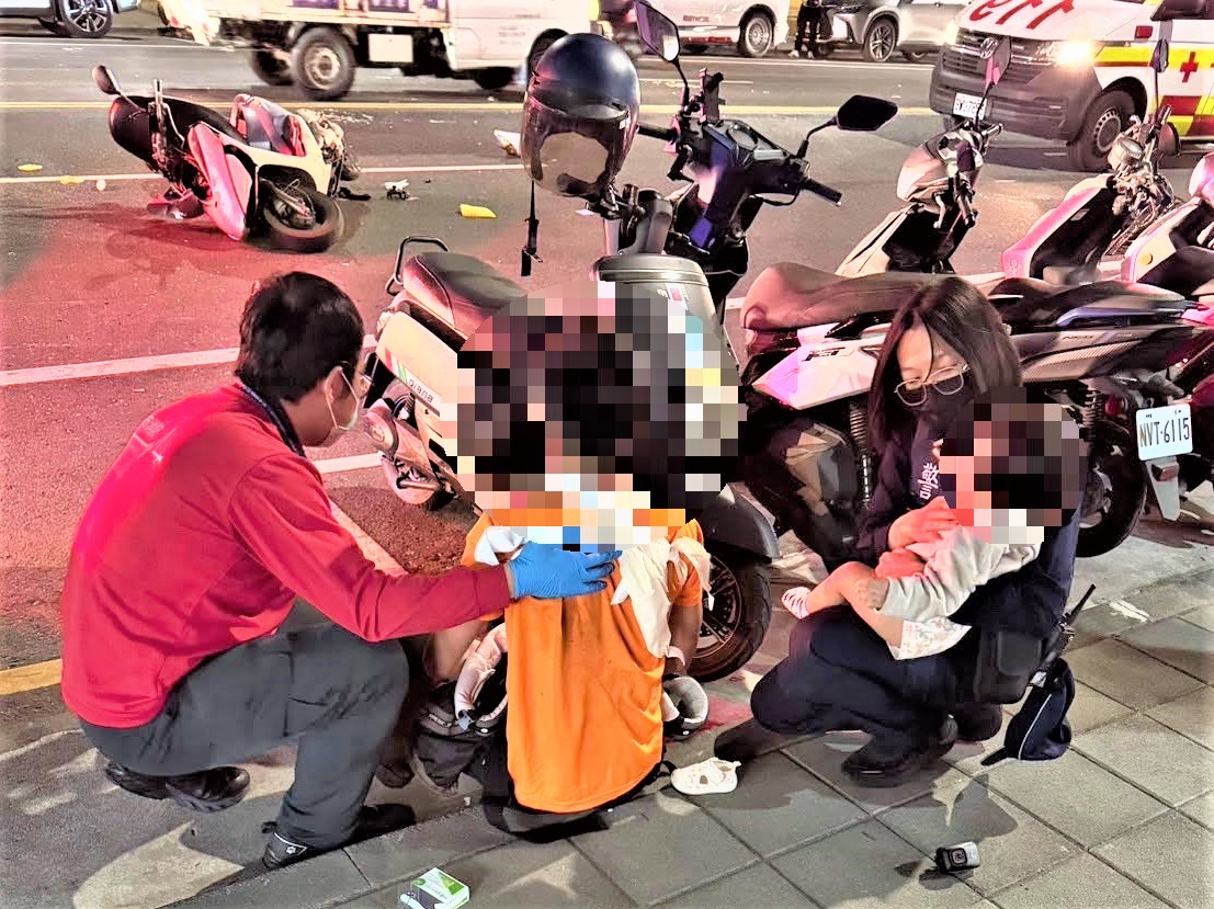 經了解得知,施男騎機車載著女童返家,途中不慎滑倒而受傷,疑似鎖骨斷裂,經救護人員緊急到場處置醫護並檢視女童身體狀況,雖沒有受傷但卻受了非常大的驚嚇,當醫護人員為施男處理傷勢過程中無法照護女童,員警主動協助照顧並安撫情緒,讓原本受驚嚇哭鬧的女童,在員警懷抱中輕聲呵護陪伴,停止哭鬧情緒已顯平靜,同時留意女童身體狀況,檢視有無受傷。