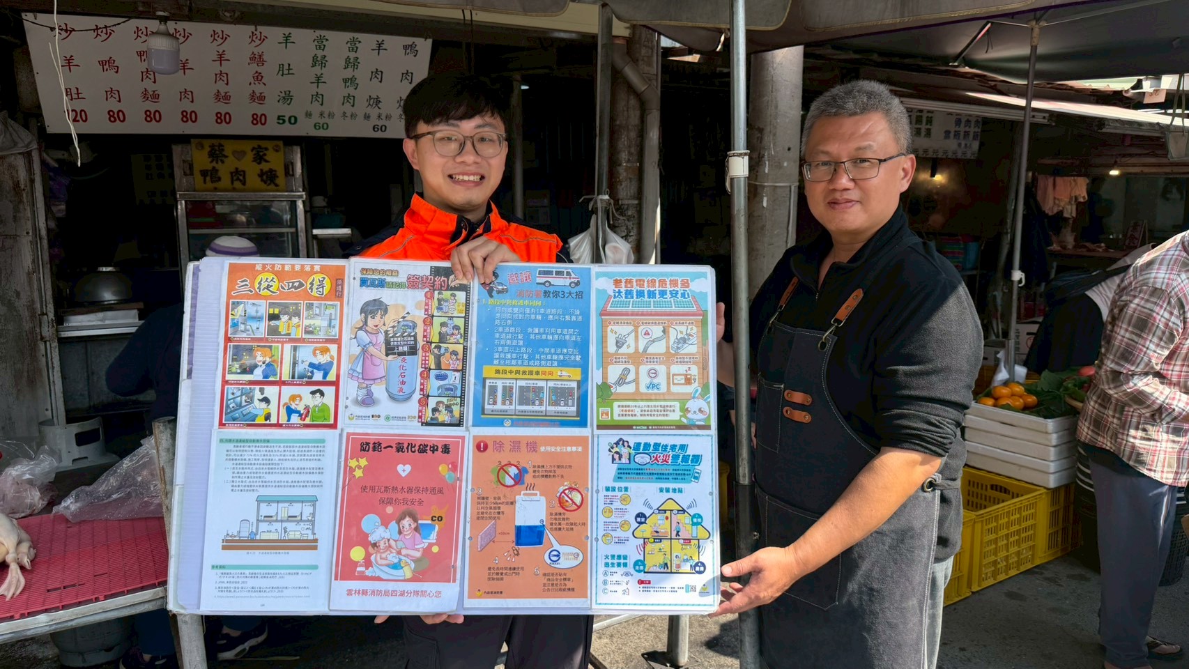 此次宣導內容貼近日常生活,提醒民眾選用防焰窗簾及地毯,可有效減緩火勢延燒速度;同時加強防範一氧化碳中毒觀念,強調保持通風與正確使用燃氣設備的重要性。分隊也宣導裝設住宅用火災警報器,並提醒屋齡較久的住宅,若使用超過20年以上的老舊配線,應儘速檢修或汰換,以降低電氣火災風險。