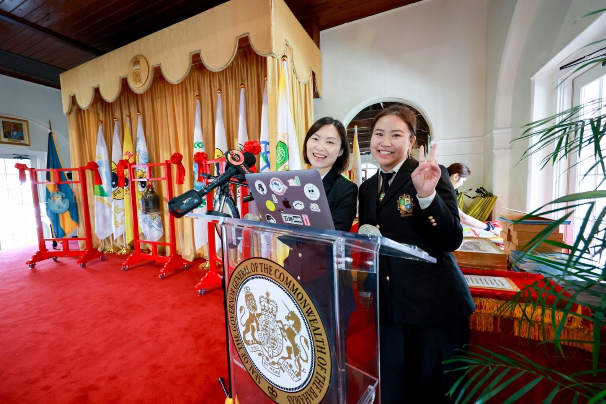 宜芳(左)在巴哈馬舉辦的「愛與和平世界領袖高峰會」中擔綱主持。