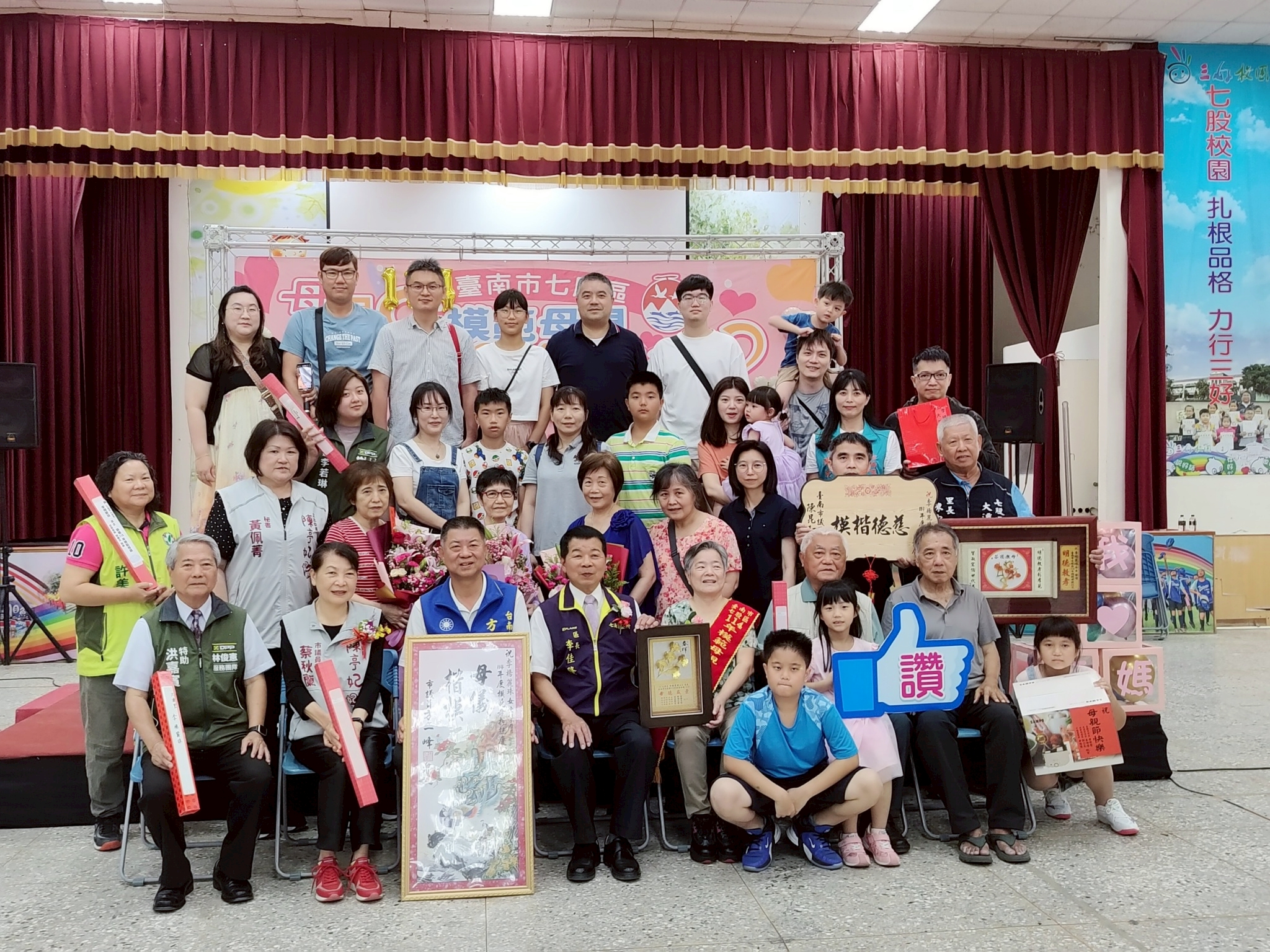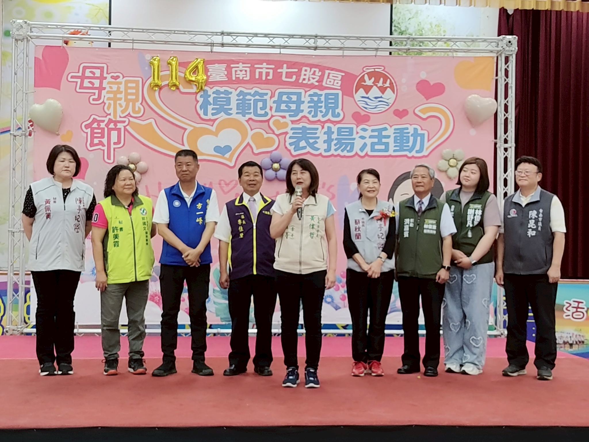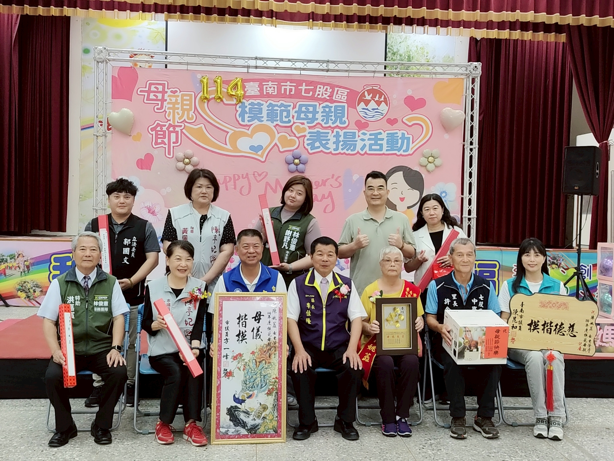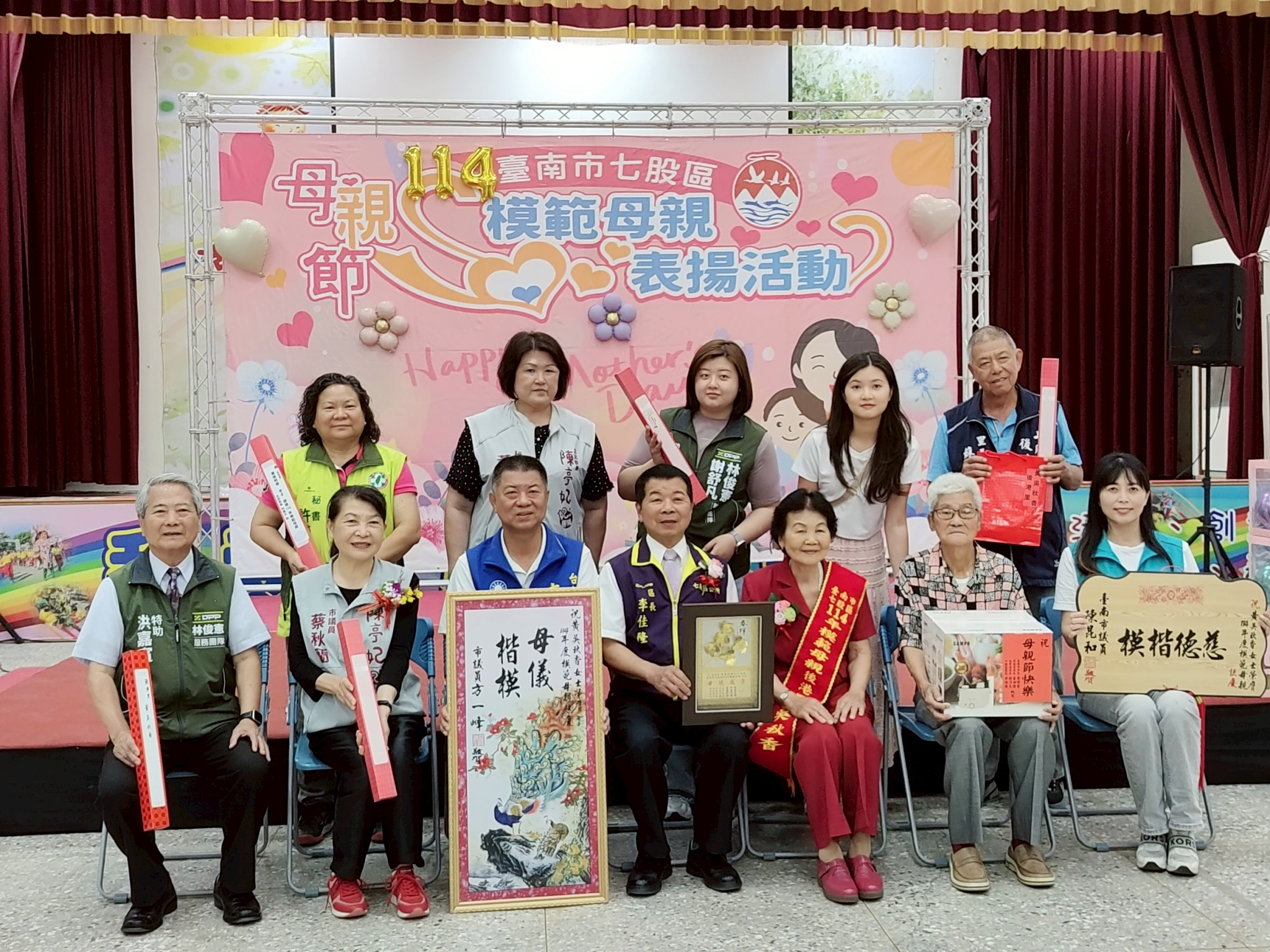 七股區長李佳隆表揚各里模範母親:大潭里李楊麗珠、後港里黃吳秋香、篤加里黃美芍、頂山里陳李金受、西寮里陳黃玉惠、塩埕里吳蘇玉藟、中寮里陳姚蕋、龍山里吳廖玉珍、溪南里陳玉華、七股里謝素貞、玉成里徐陳金治、大埕里黃楊寶鳳、樹林里黃林反、竹橋里張江焿、義合里黃葉秀蘭、永吉里黃霨潾、三股里莊李彩鳳、十份里陳卓月桃等18位。