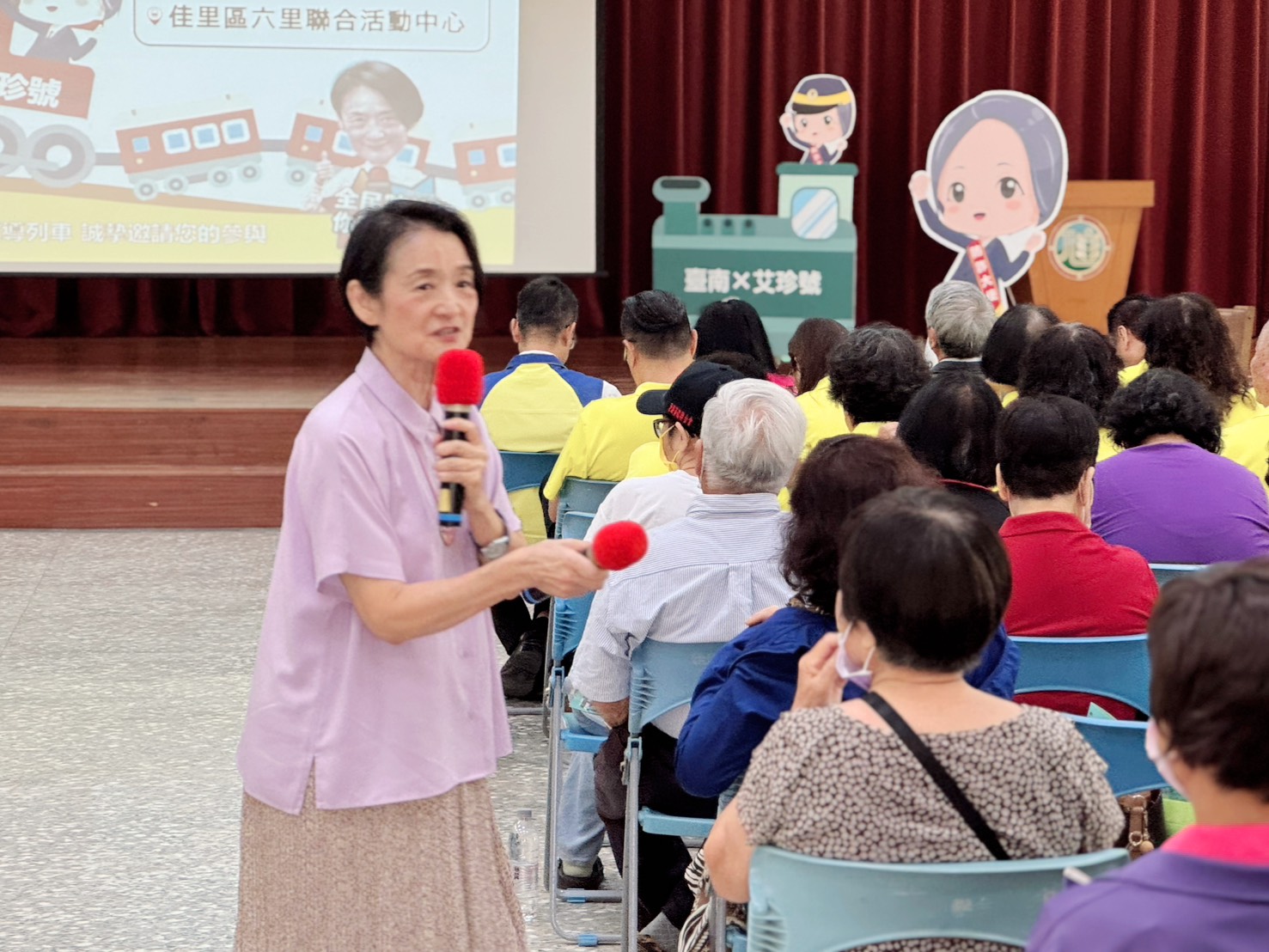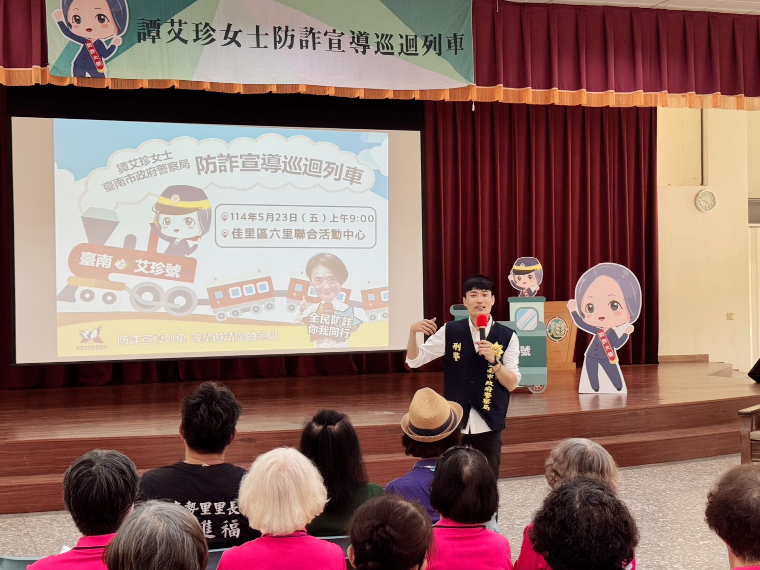 佳里分局今(23)日在佳里區六里聯合活動中心,舉辦「譚艾珍防詐宣導巡迴列車活動」,邀集各里長及民眾參與,包括佳里區長林耿漢、市議員謝舒凡、方一峰、蔡秋蘭、立委林俊憲特助洪嘉賓、陳亭妃秘書謝四川、市議員蔡蘇秋金丈夫蔡寶財、陳昆和助理李佩玟、市政府法制處消保官林嘉薇、安西里長陳雅慧、六安里長林佩玲、東寧里長林育如、忠仁里長楊林錦鴦、南勢里長黃進福、佳化里長張清水、建南里長陳俊銘等160名民眾到場聆聽。